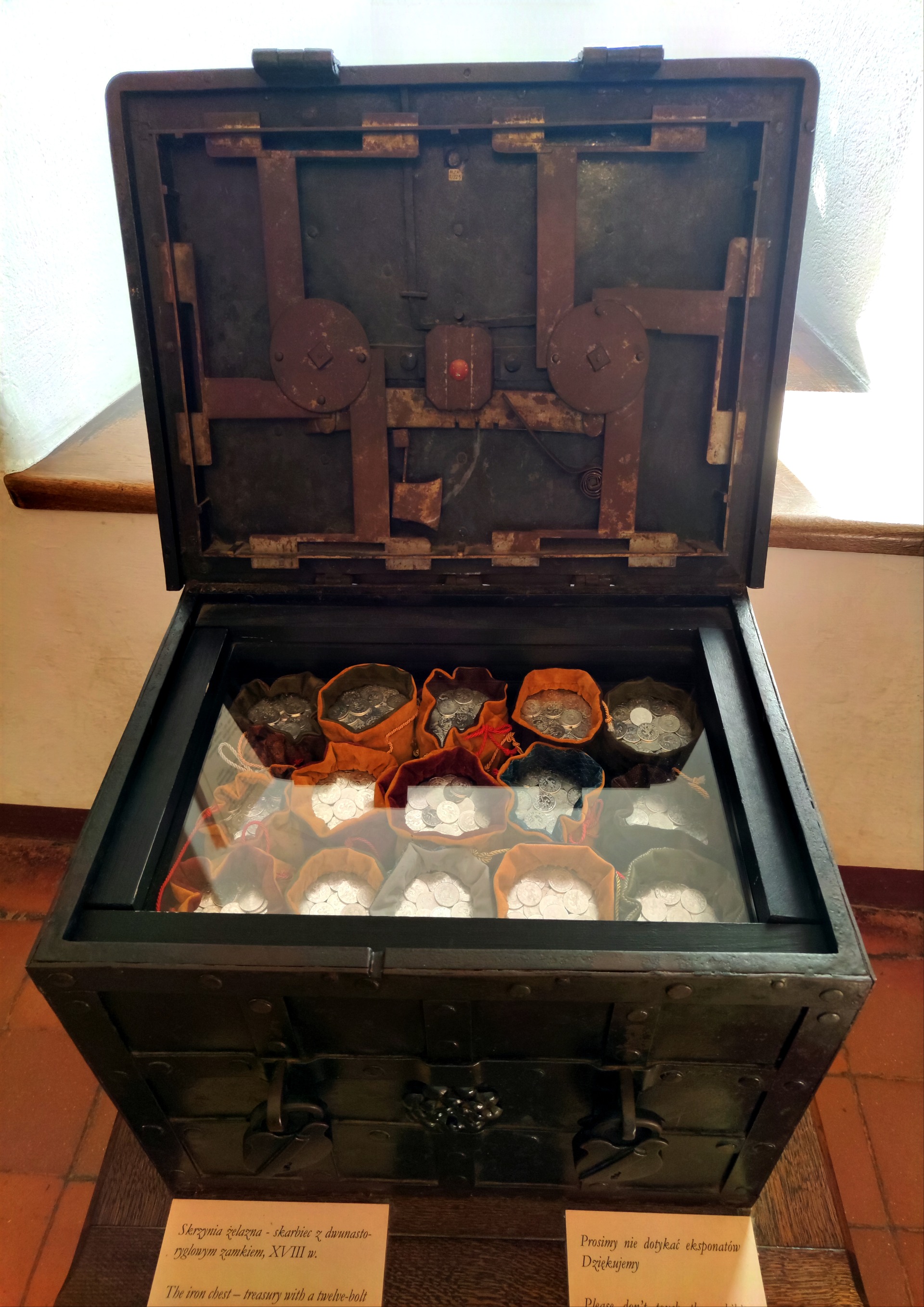 The displayed coats of arms represent the families that ruled the castle in each century. The coat of arms depicting the castle tower placed on a boat represents the Łaski family, mentioned earlier.