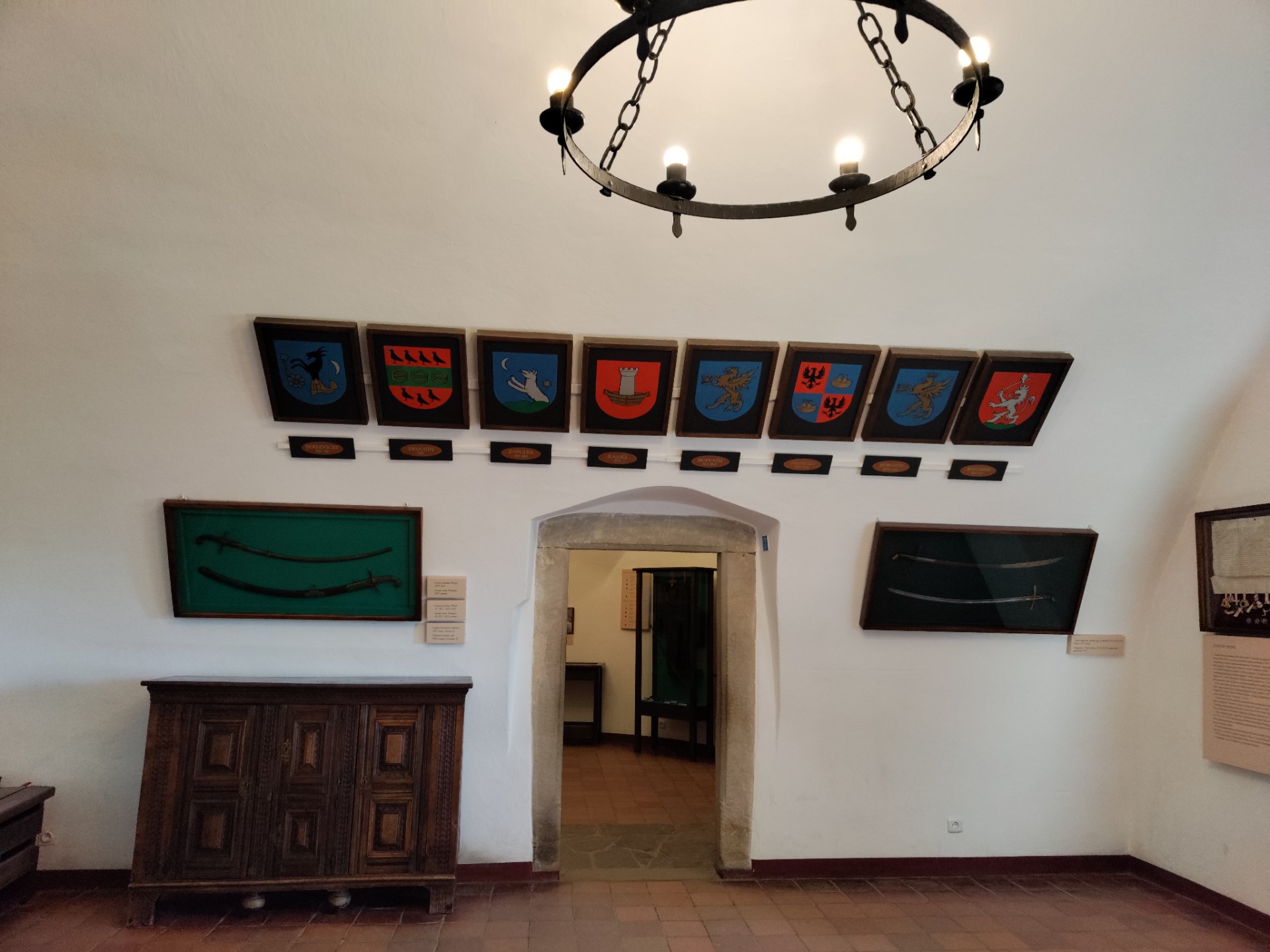 Wywieszone herby przedstawiają kolejno rody, które władały zamkiem w poszczególnych wiekach. Herb, czwarty od lewej, przedstawiający wieże zamkową umieszczoną na łodzi to wspominamy wcześniej ród Łaskich.