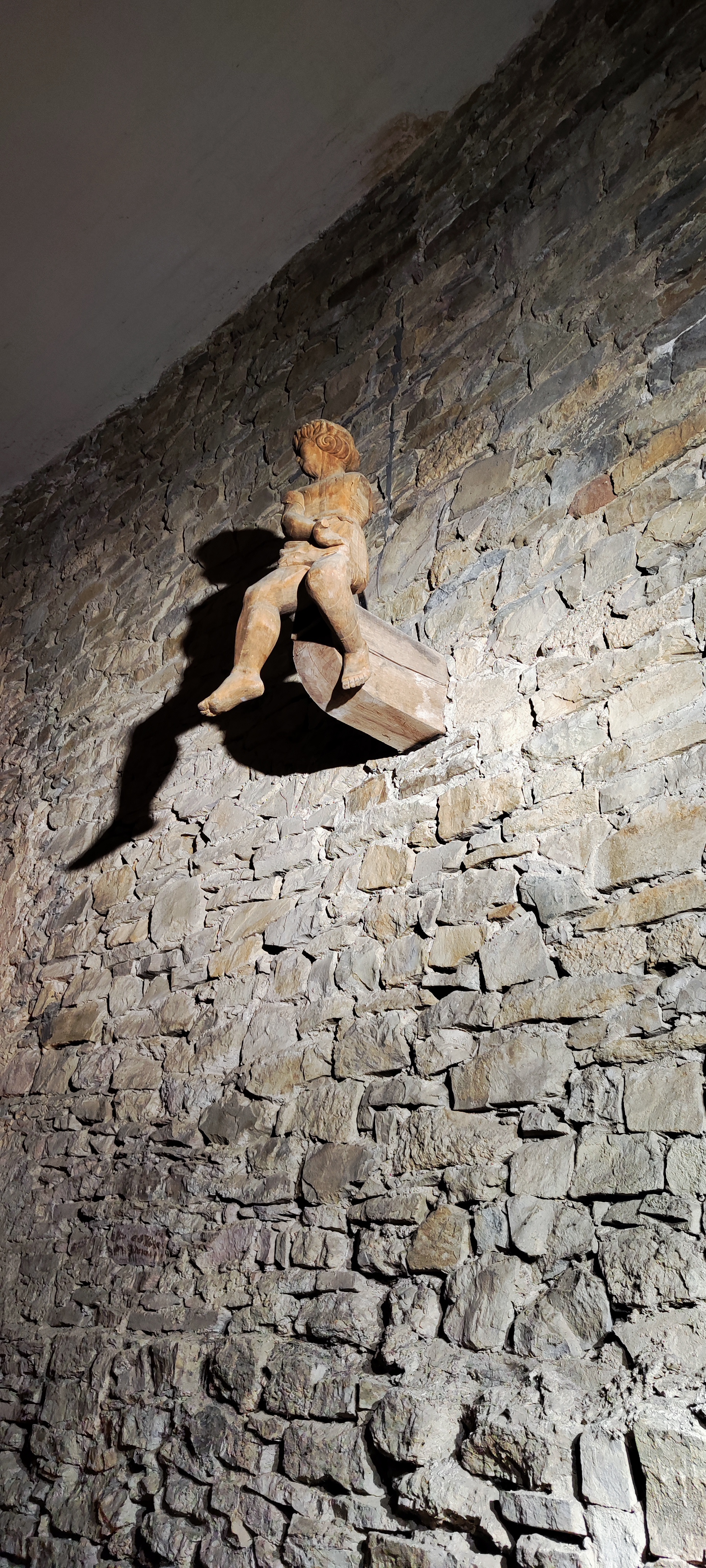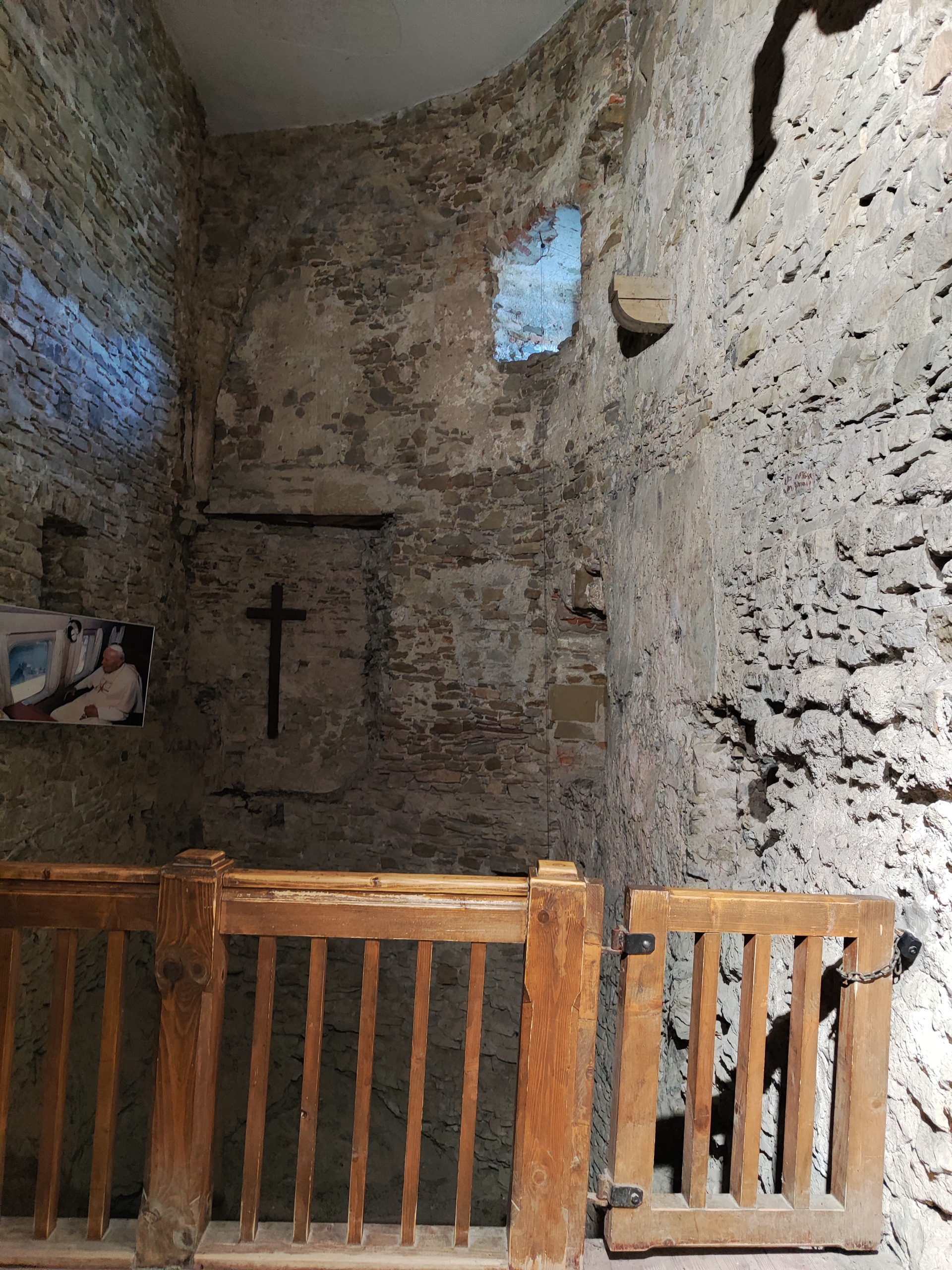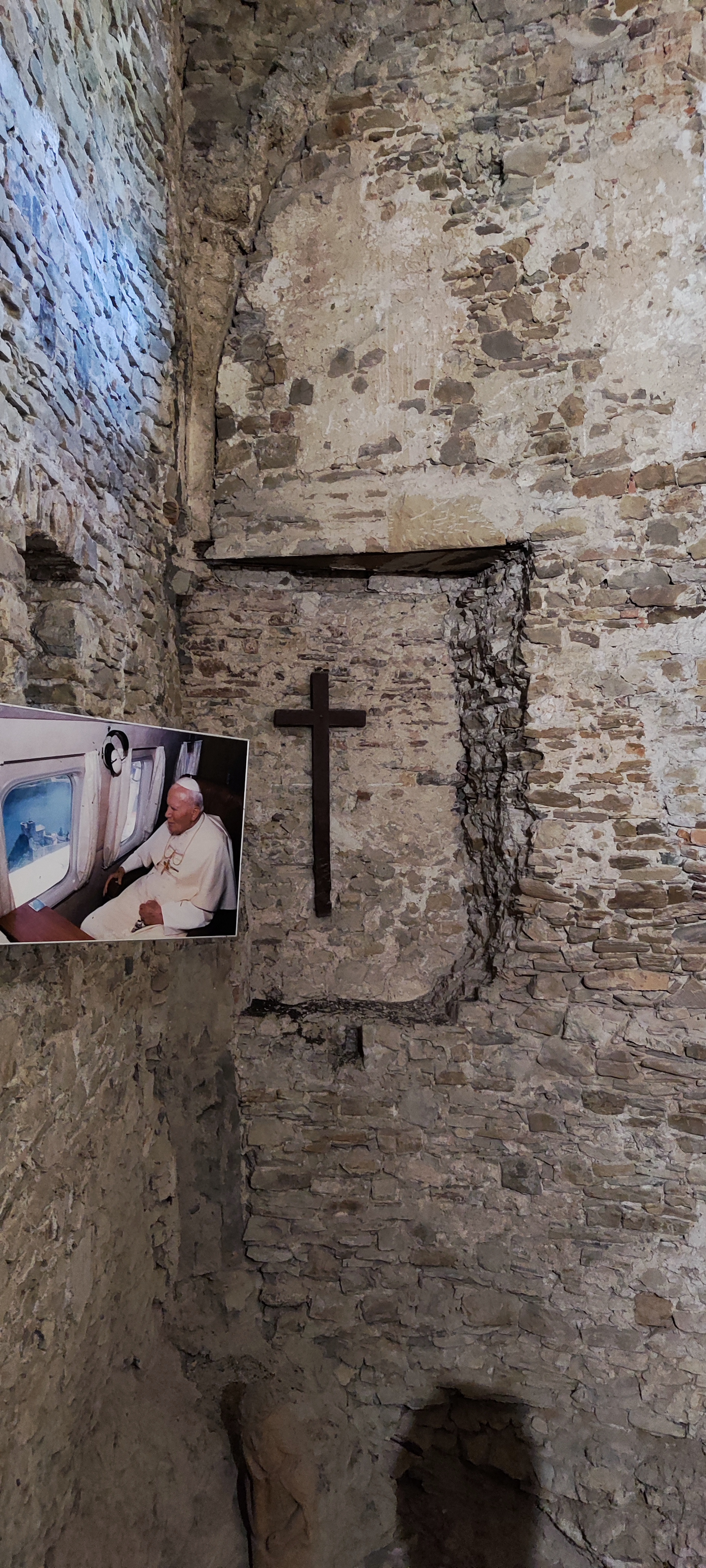 The oldest chapel in the castle was built in the second half of the 14th century, when it was owned by the Brzevicki family. A water cistern was located beneath the chapel. The chapel walls were decorated with frescoes, of which only a barely legible fragment depicting the Crucifixion, preserved in the castle library, survives. The destroyed chapel was thoroughly rebuilt by its next owner, as documented in 1700. Only traces of the vault and a small window in the wall remain from that period. The Baroque wooden altar from this chapel was moved before 1823 to a new chapel in the gate tower. It later fell into disrepair, and after World War II, it was thoroughly restored and moved to St. Andrew's Church.