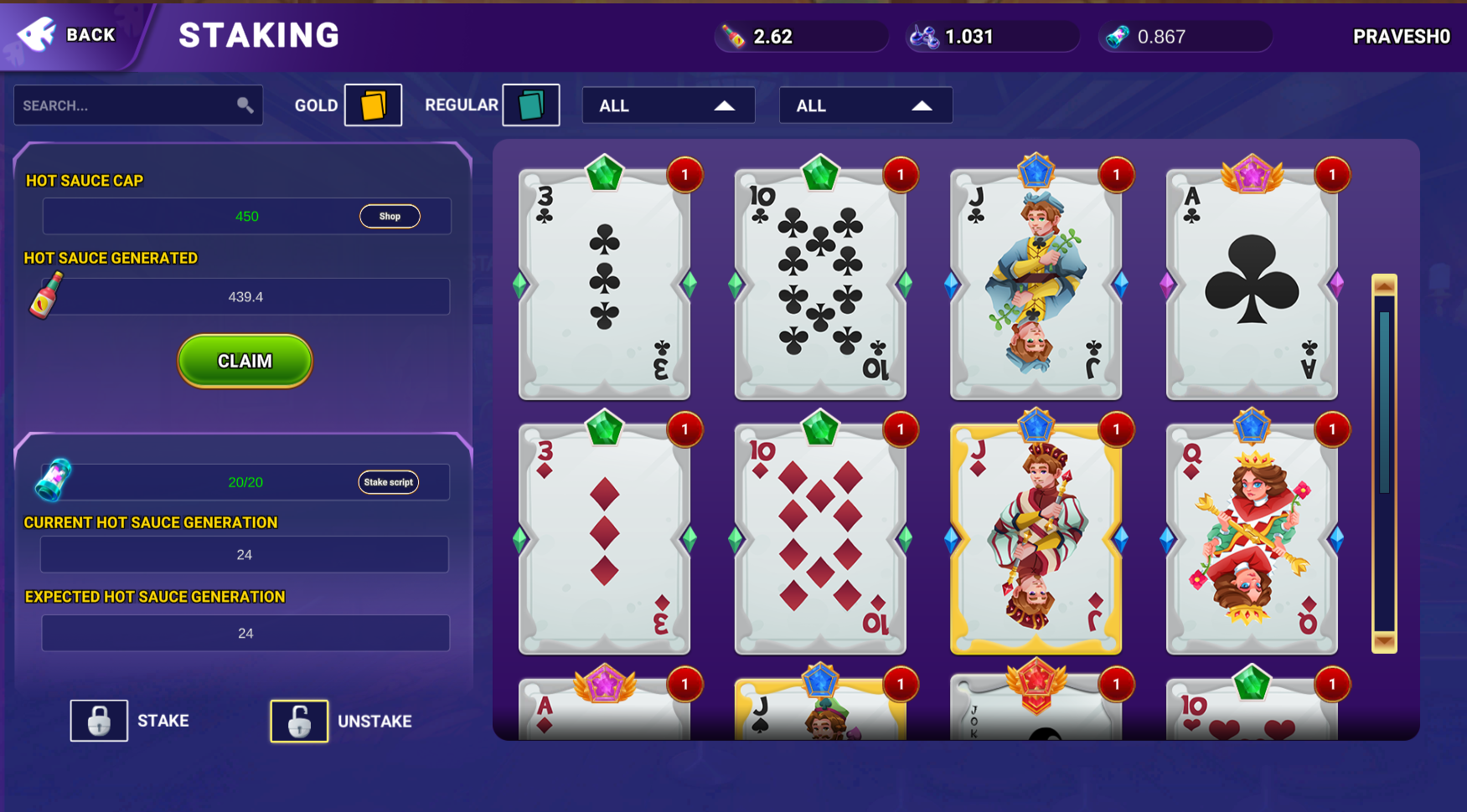 It is not a simple gambling game; there is an initial investment required for you to play it. The way it works is you can only bet with the currency called Hot Sauce, and to generate it, you need to stake cards, which are only opened by buying Packs or by purchasing individual cards from the market. The market price seems to be high for cards right now, so I recommend you to buy packs if you want to get into it. These packs are called Ladyluck packs, and I bought and opened 8 of them so far in my journey. Depending on the rarity of cards you pulled from these packs, you generate more Hot Sauce if you stake rare cards. Just keep in mind that each card staked requires 2 Script tokens to be staked, which can be bought from Hive-engine.