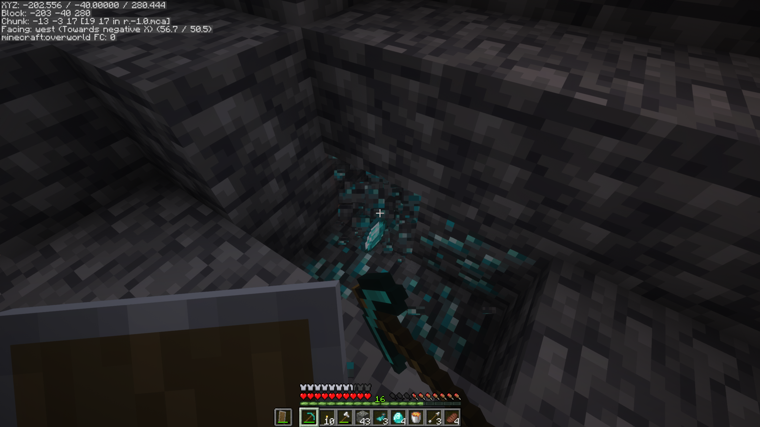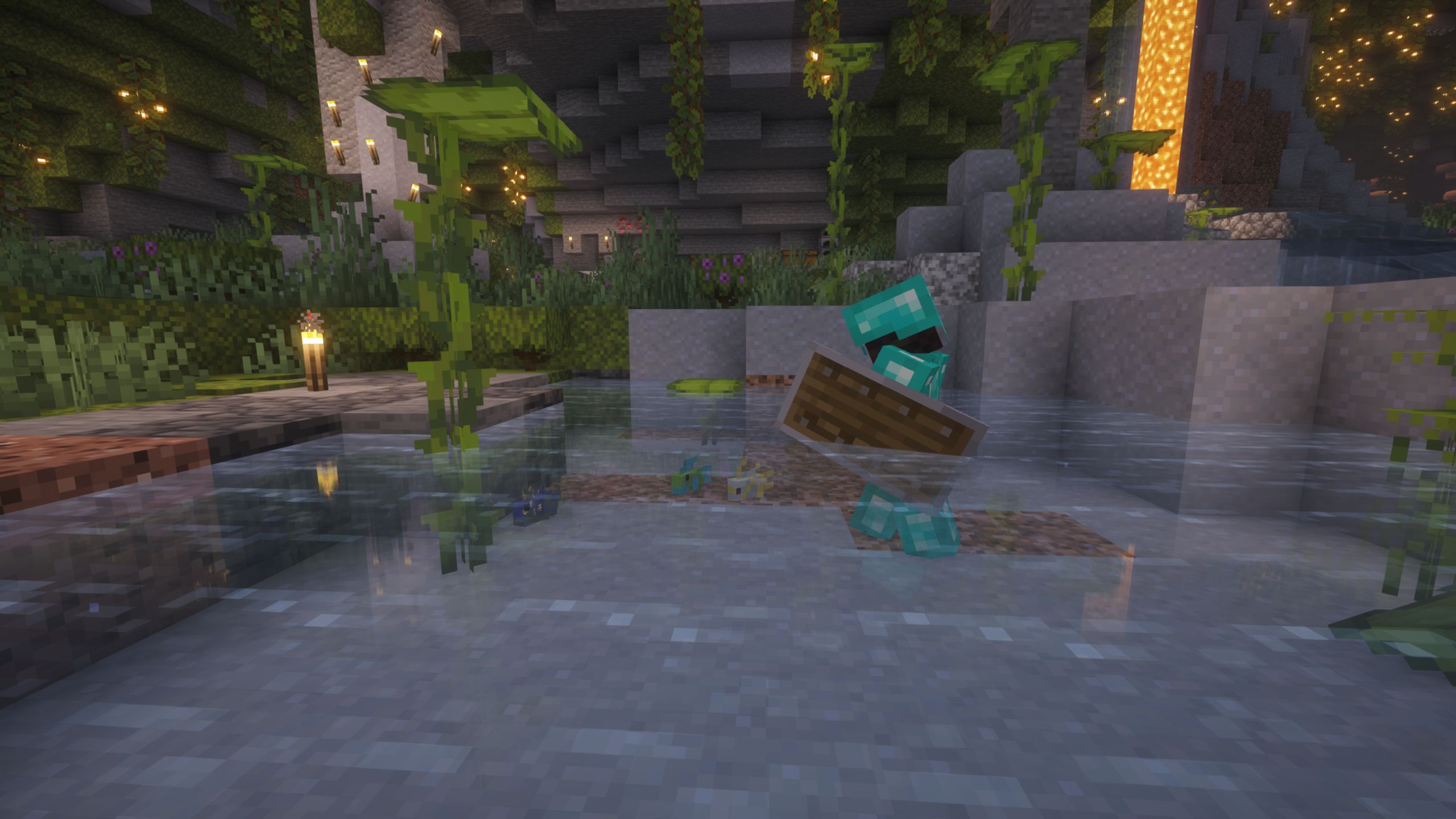 We went deep inside the cave and started to find some diamonds. I turned on the shaders and increased the cave brightness. It was working well.