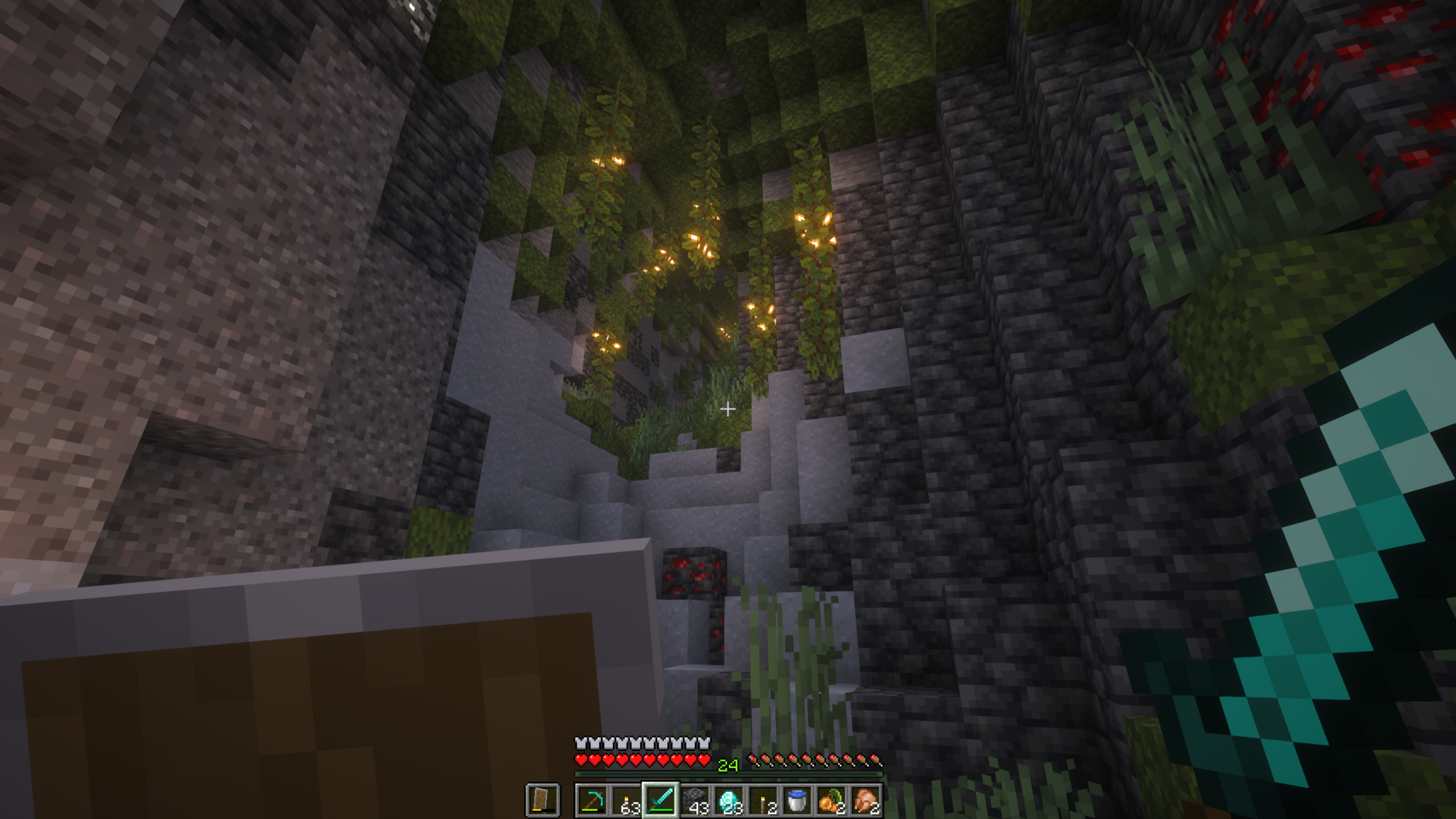 We loved this place so much and decided to make it our base. It provides light, food, water and other useful items right here. We found enough diamonds to complete our sets. With caves as big as these, branch mining is no longer the fastest way to get diamonds.