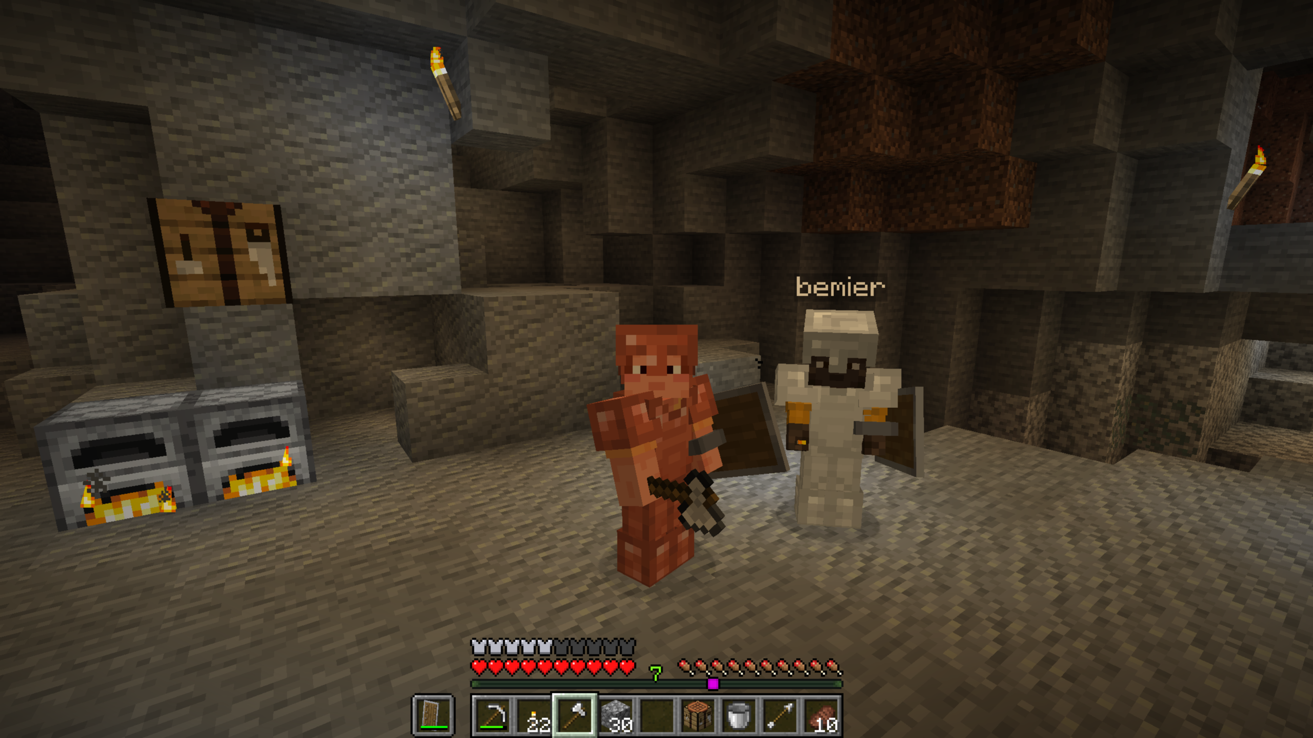 We gathered the basic tools and killed a lot of mobs during our first day. Once we had enough wood and food, it was time to start our mining adventure and gather some resources. Luckily, we spawned next to one of the biggest caves we had ever found.