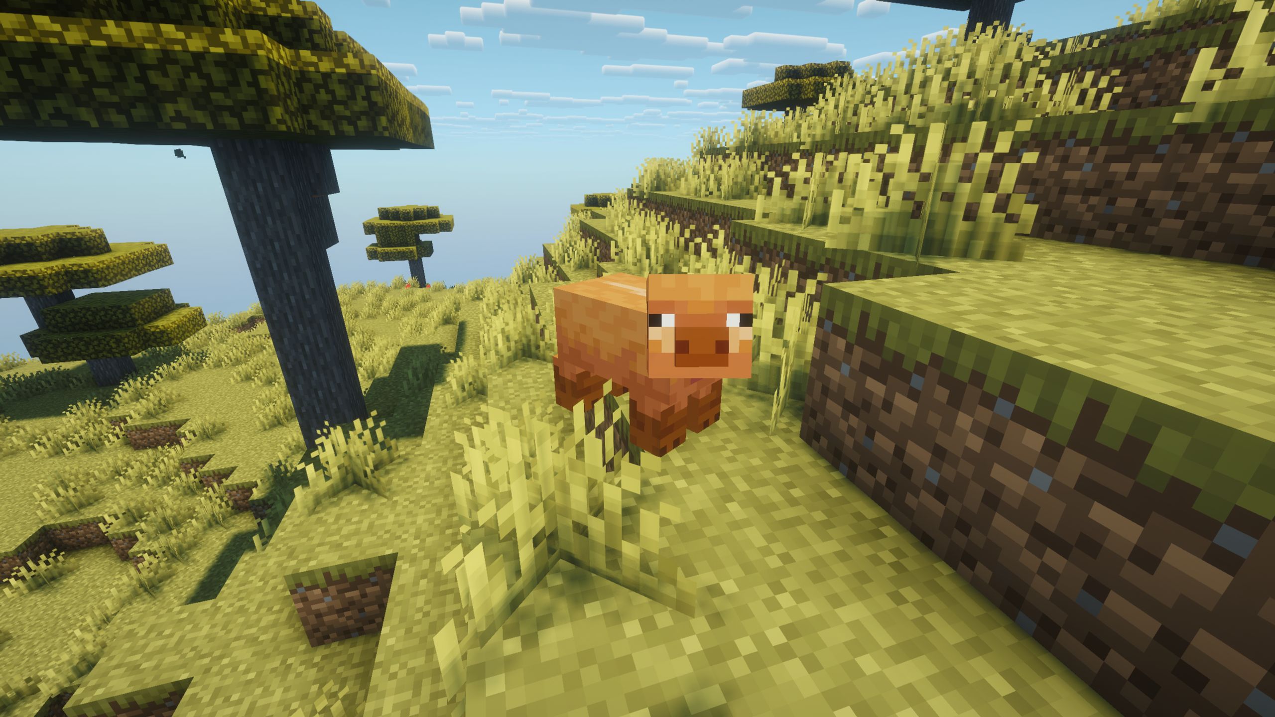 We spawned near an ocean, on a Savannah biome. And soon noticed one of the new things that we missed in the last few updates. Pigs, cows and chickens now have different fur variants depending on the location they were spawned in.