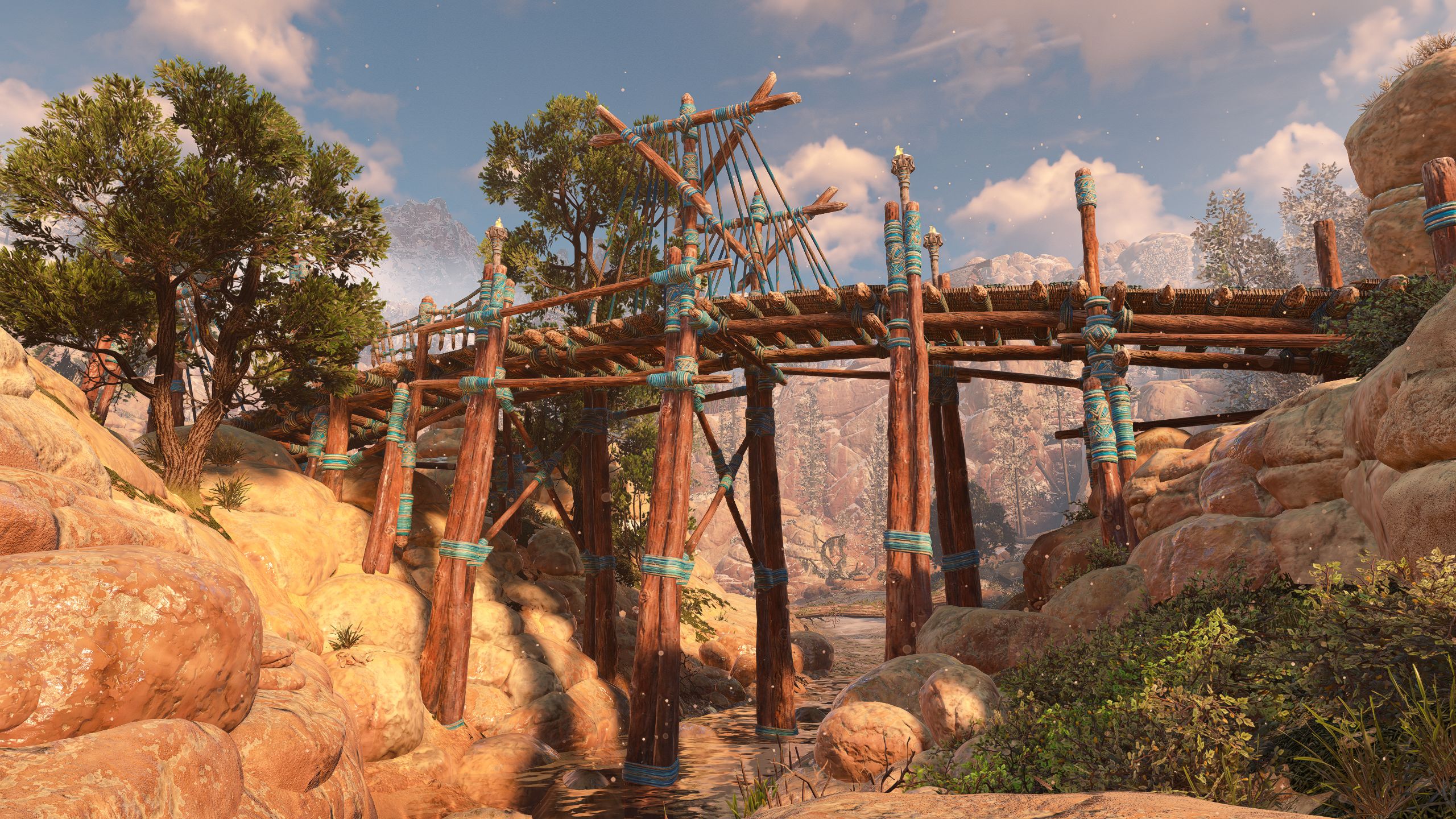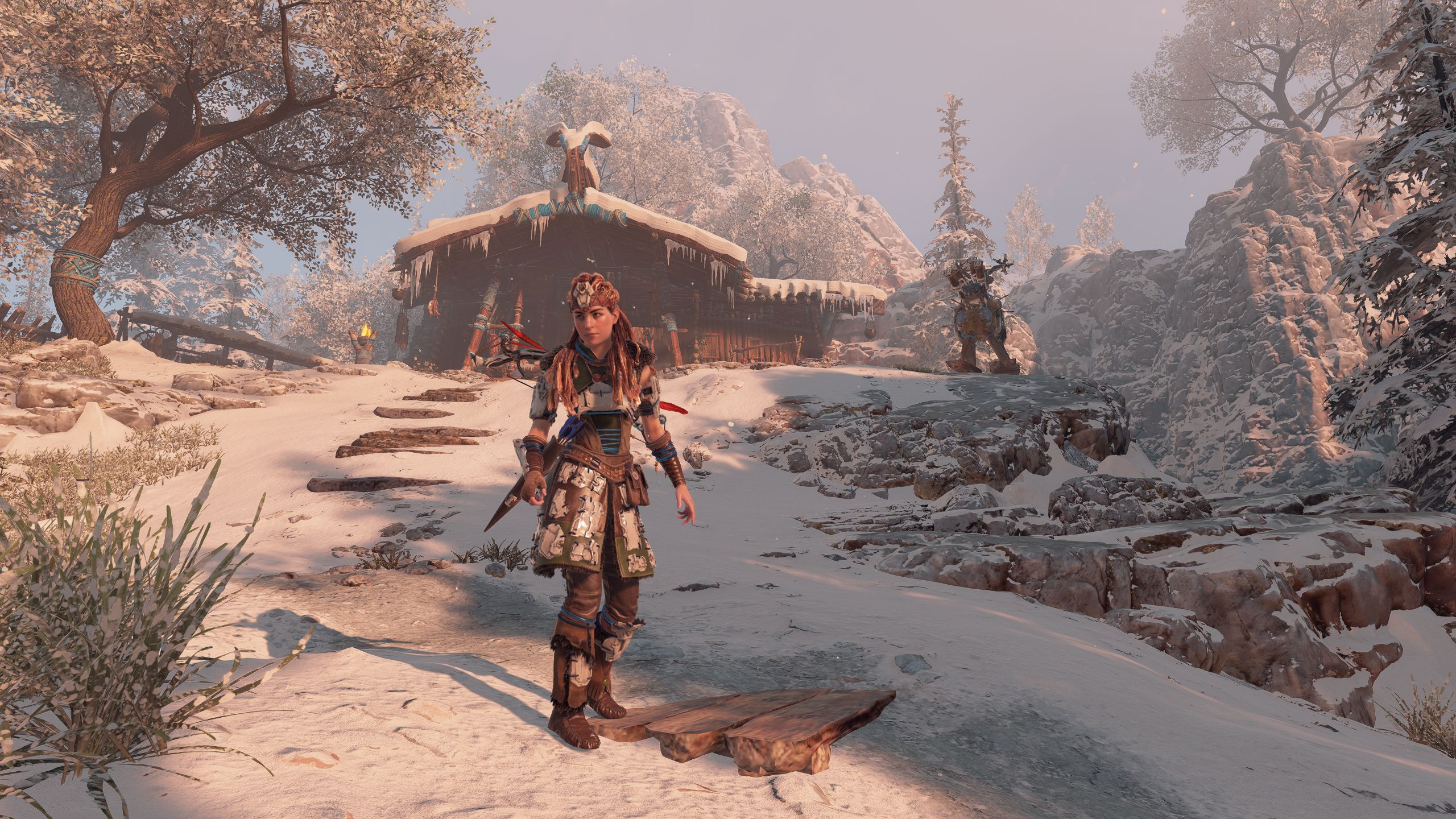 There are a lot of primitive structures made out of wood and ropes, especially near the settlements. I love to capture them too. The blue ropes give it a distinct look; you can find a lot of blue highlights in the game. It seems like the Nora tribe loves this colour.