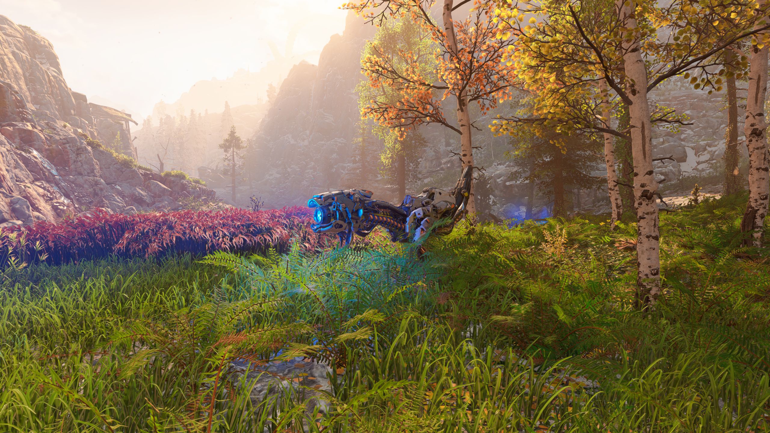 I can end this post without showing you a shot of a machine. After all, it is Horizon Zero Dawn. So, here is a Watcher roaming the plains and trying to observe any movements in the bushes.