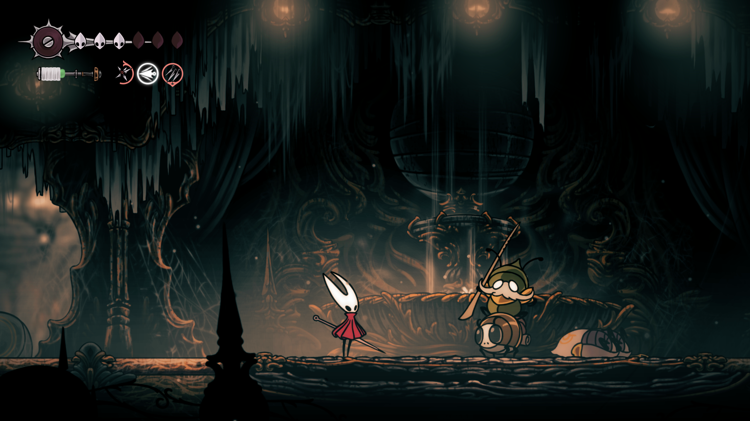- **Memorable NPCs** - In Pharloom, there are a lot of living NPCs which seem to have their own unique story. Hornet actively goes out of her way to save a few of them from danger. There are a lot more traders and normal bugs who are ready to help you in the game. Many of them give you tools or upgrades that are essential for your journey. Some of them are even linked with unlocking Act 3 of the game. There is a big surprise with some of them. I loved the Bellbeast, which is like a stag from Hallownest. You have to defeat it first for it to give you a ride and unlock the Bell stations. Later in Act 3, there is a surprise fight with a similar creature. It even has cute babies, which help us quick travel.