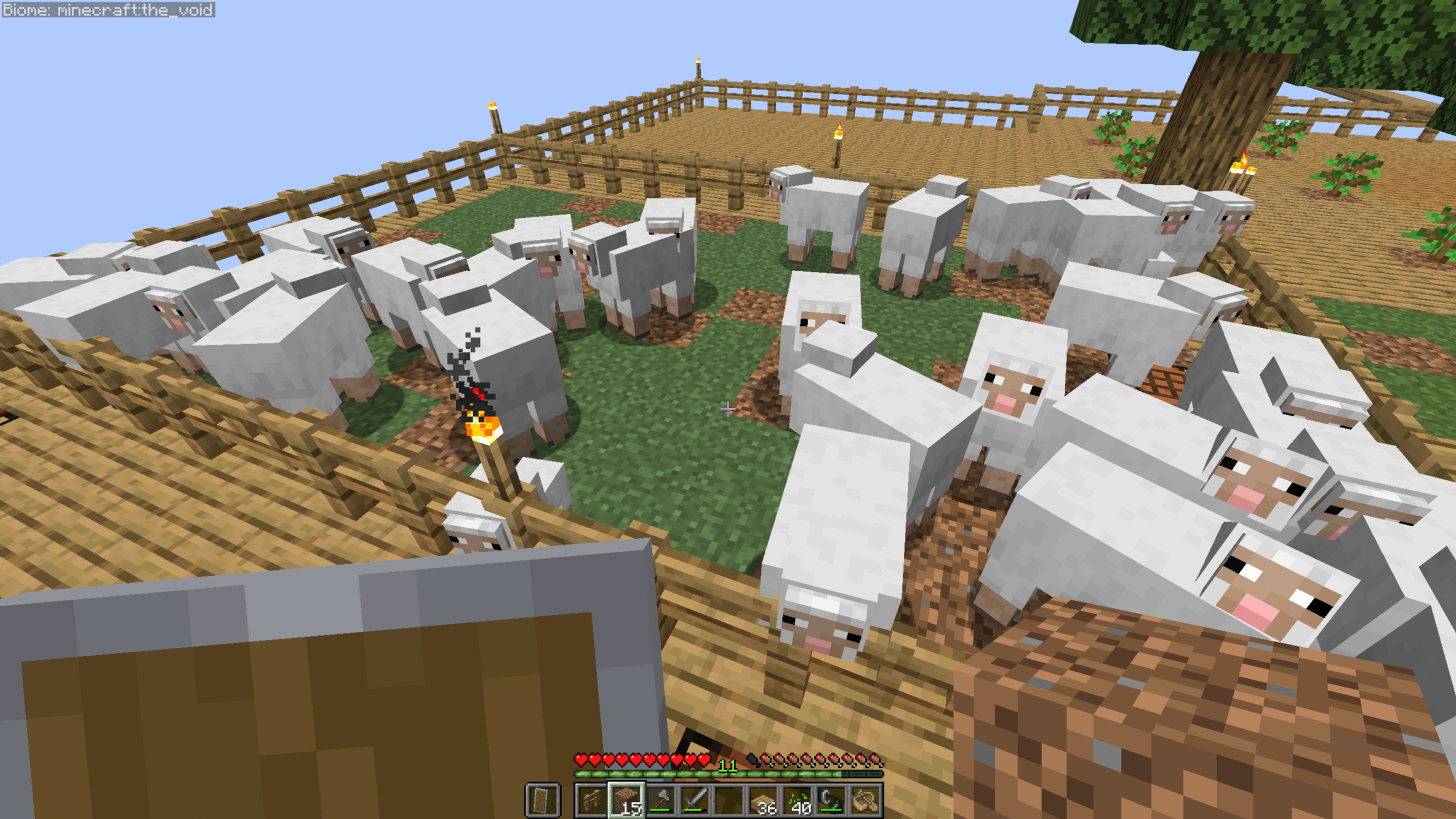 We had three sheep spawned on our island on the first day, but one of them met with an accident and fell into the void. This triggered us to make a secure area for them, and we bred the remaining two with all the wheat we had grown so far. They multiply very quickly, and look at how many we had in a few days.