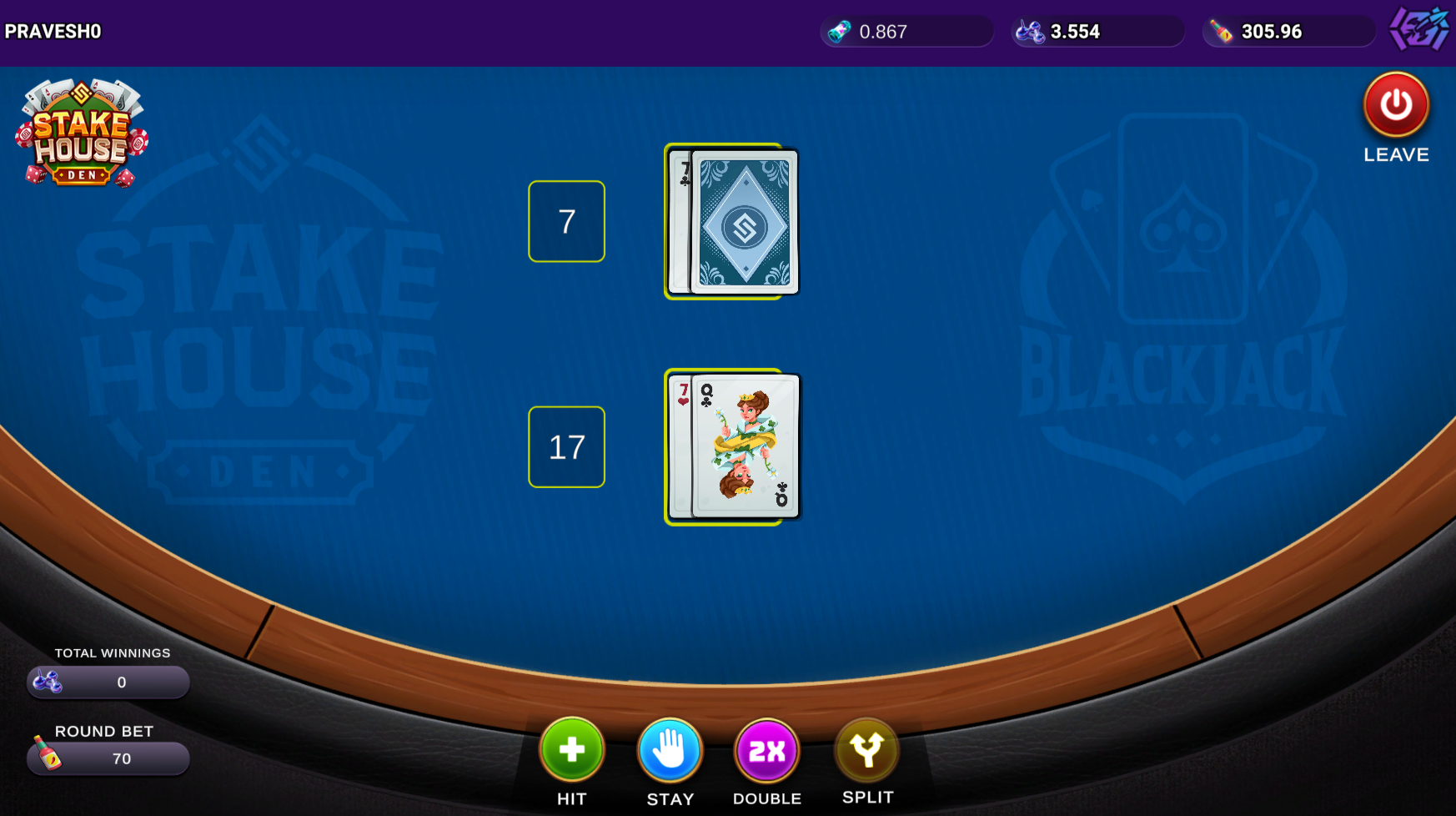 In the first round, I had a 17 vs a 7 from the dealer. I never hit on 17 or high, so I decided to stay and got rewarded as well.