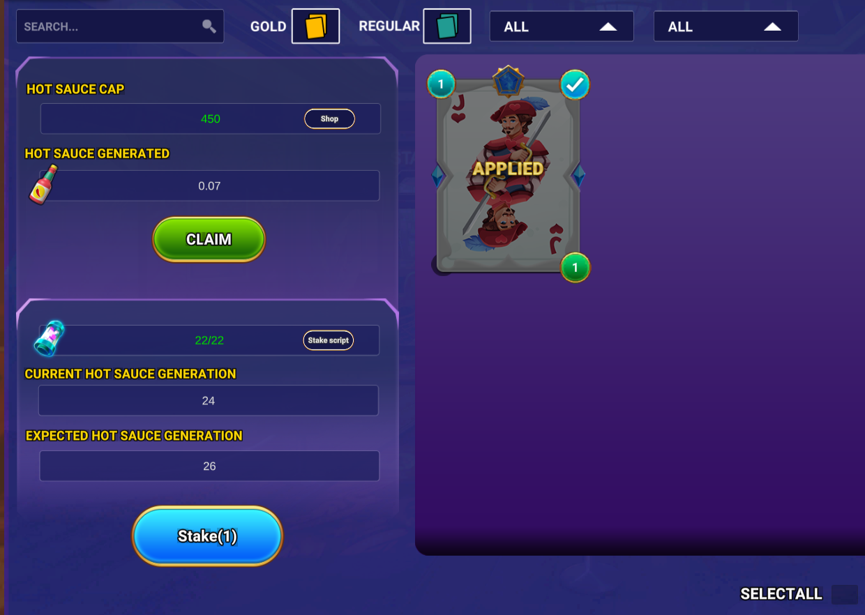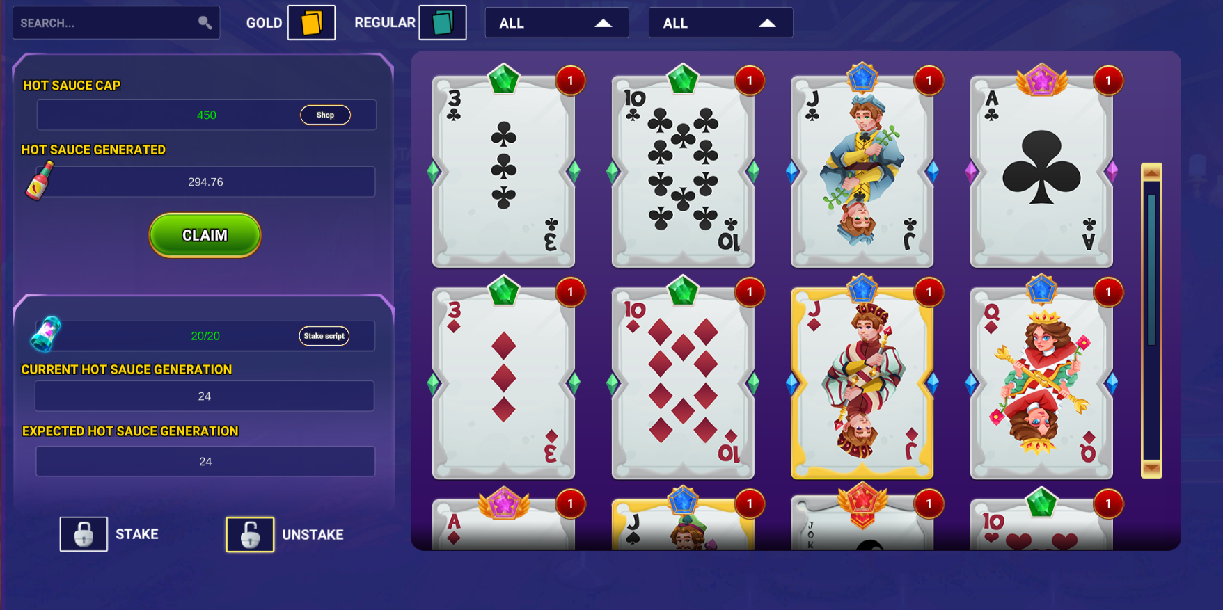 I staked another card in the game. It was a rare Jack of hearts. But before that, I had to bug a couple of SCRIPT tokens and stake them in the game. Each new card staked requires two more SCRIPT tokens to be staked. With this new staked card, now I have a total of 11 cards staked and they are generating me 26 Hot Sauce. It is still a small number, and I will slowly try to increase my staked cards so I can play more often.