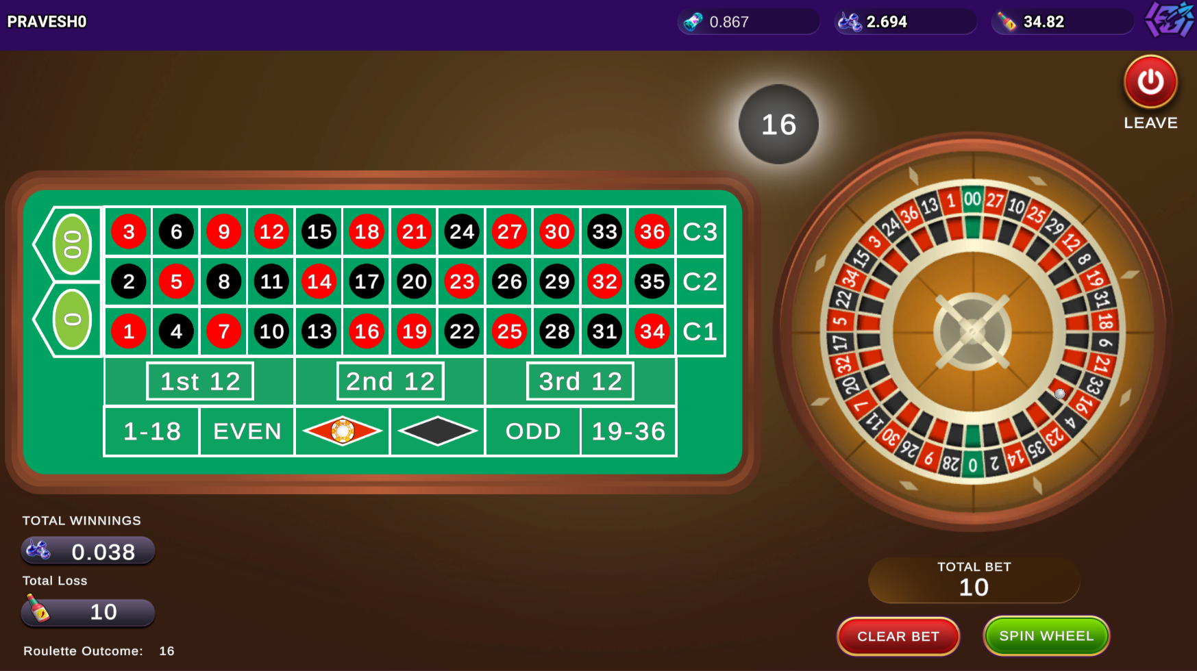 I always play a couple of rounds of Roulette, but never go for big wins and always play the 2x bets like the odd-even or colours. I bet 10 Hotsauce on red colour and lost the first round. But the second round was luckier, and the ball stayed on the red number. I just got 0.038 rewards from winning this round.