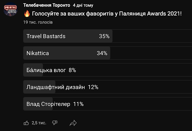Також "Телебачення Торонто" вже вдруге провели свою премію "Паляниця Awards". Цьогоріч у зміненому вигляді. Номінувалось лише п’ять каналів: * Travel Bastards * Nikattica * Ба́лицька влог * Ландшафтний дизайн * Влад Сторітелер