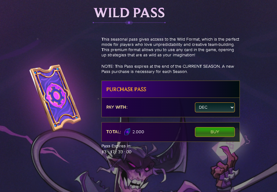 To play in the Wild format, we first need to purchase the Wild Pass. And the Wild Pass costs 2000 CREDITS or 2000 DEC, and the purchased Wild Pass is valid for the current season, meaning a new Wild Pass must be purchased for each season. I purchased a Wild Pass for 2000 DEC and unlocked the Wild format for the current season.