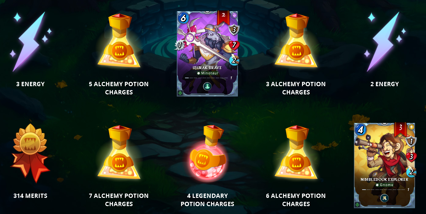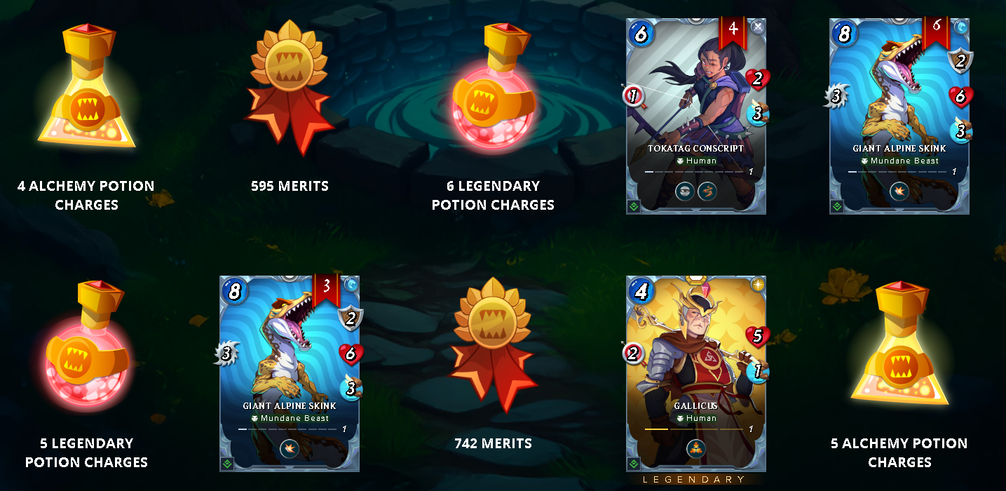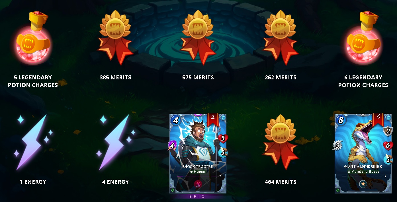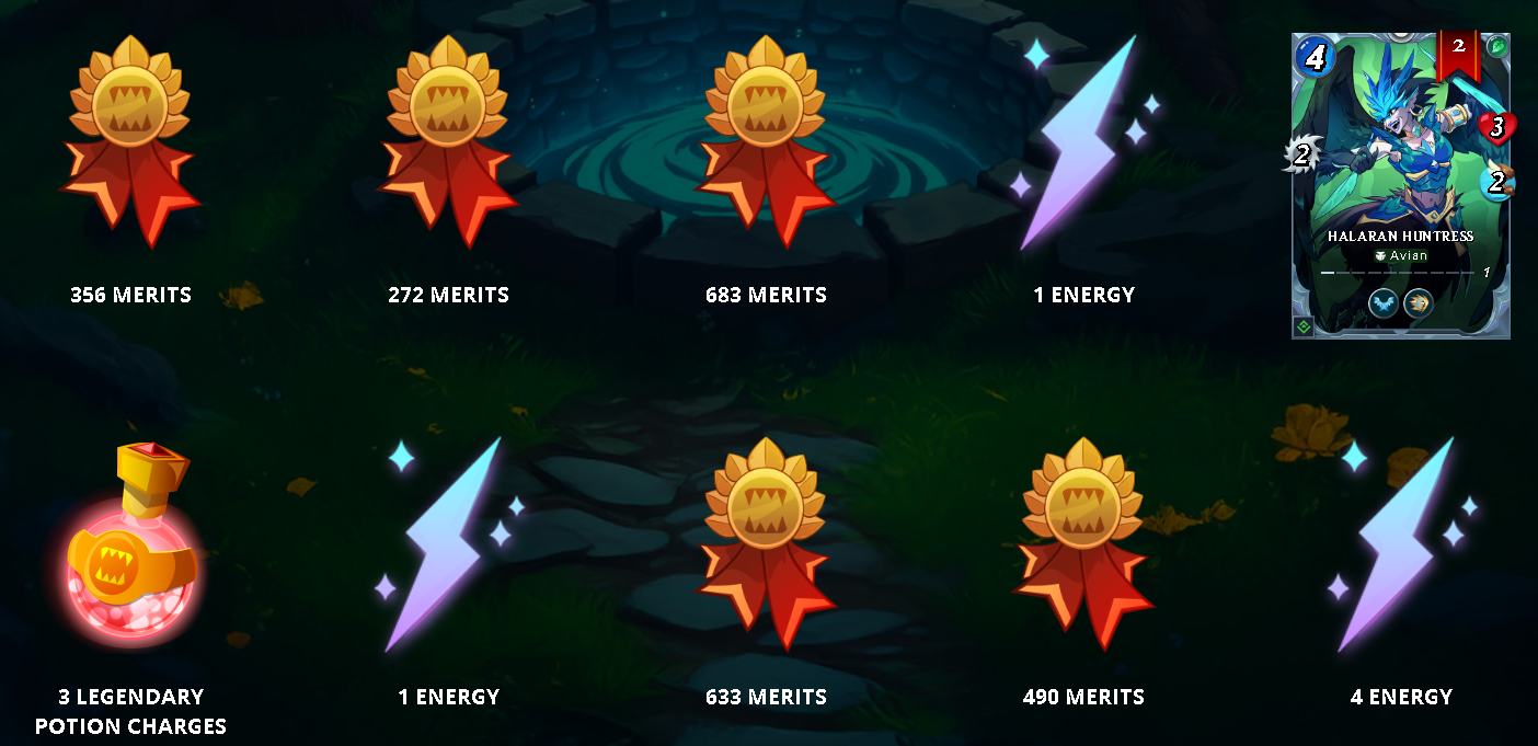 I got 1 Legendary, 2 Epic, 3 Rare, 54 Common Rebellion reward cards, along with Merits, Energies, and Potions. I can say I'm very happy with my rewards, especially since getting another copy of the Gallicus card was great, so I upgraded it to level 2. Of course, I am very pleased with my other rewards as well. As my deck grows, my chances of winning battles increase, so I like to get cards from chests. Also, Energies allow me to play more in Wild, while Merits allow me to purchase Gladius chests, so I like to get Merits and Energies, and I just got quite a few of them.