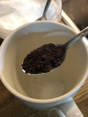 Während die Milch erhitzt wird, gibst du einen Löffel Zucker und einen Löffel löslichen Kaffee in deine leere Tasse.