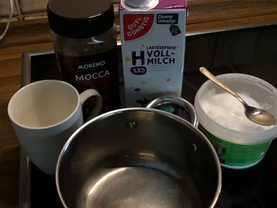 Für die Zubereitung braucht man nur ein paar Dinge: löslichen Kaffee, Zucker, Milch, einen kleinen Topf, eine Tasse und einen kleinen Löffel.