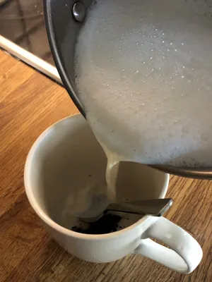 First, measure the amount of milk that fits into your cup. Pour it into the pot and warm it up slowly on low heat.