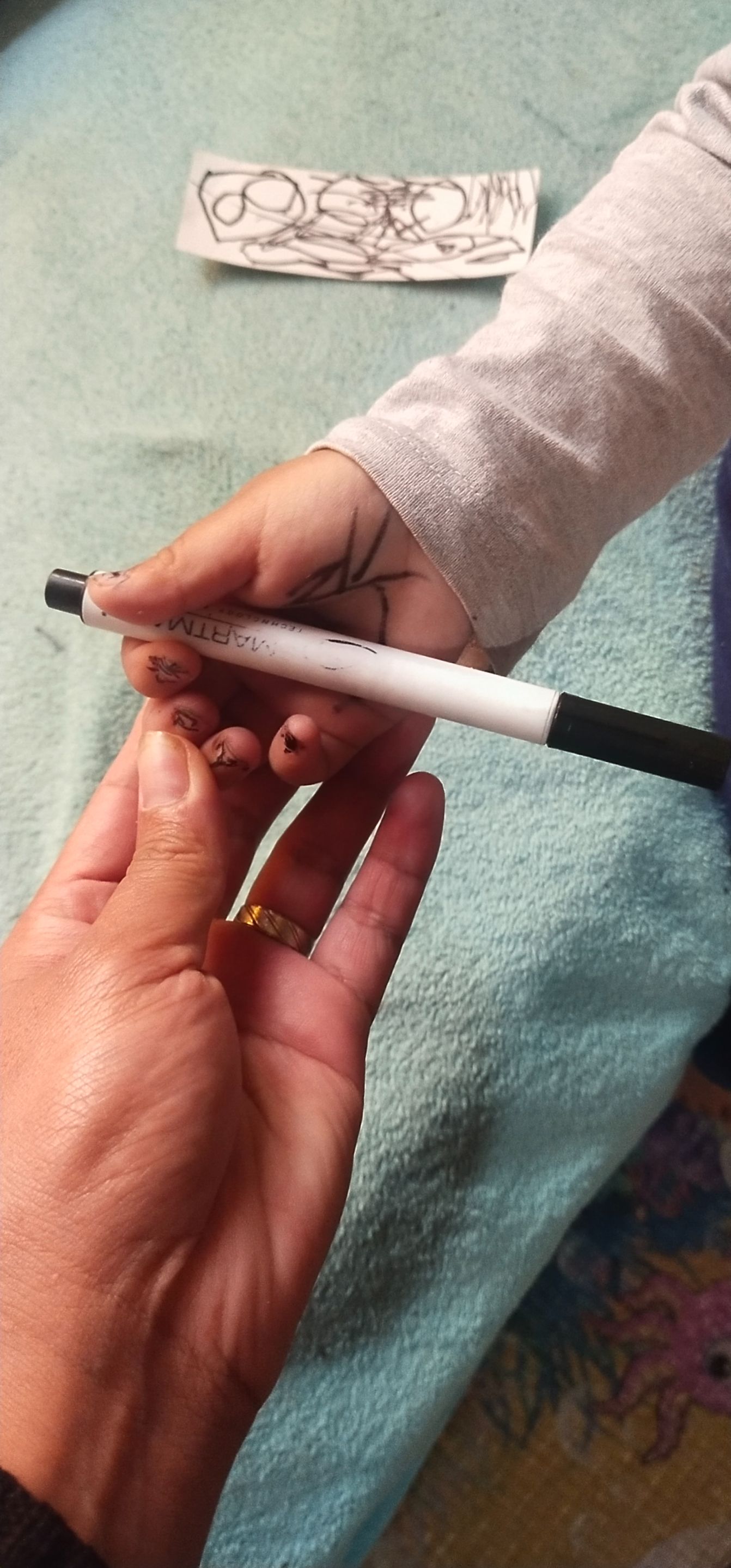 While I was putting my 7-month-old baby to sleep, my two-year-old baby girl decided to create her own little artwork. I just let her watch TV but I didn’t realize that she had quietly gone to my table, grabbed my pens, and gave herself a little “makeover”! She draw all over her hands and giving herself a pentel-pen manicure!