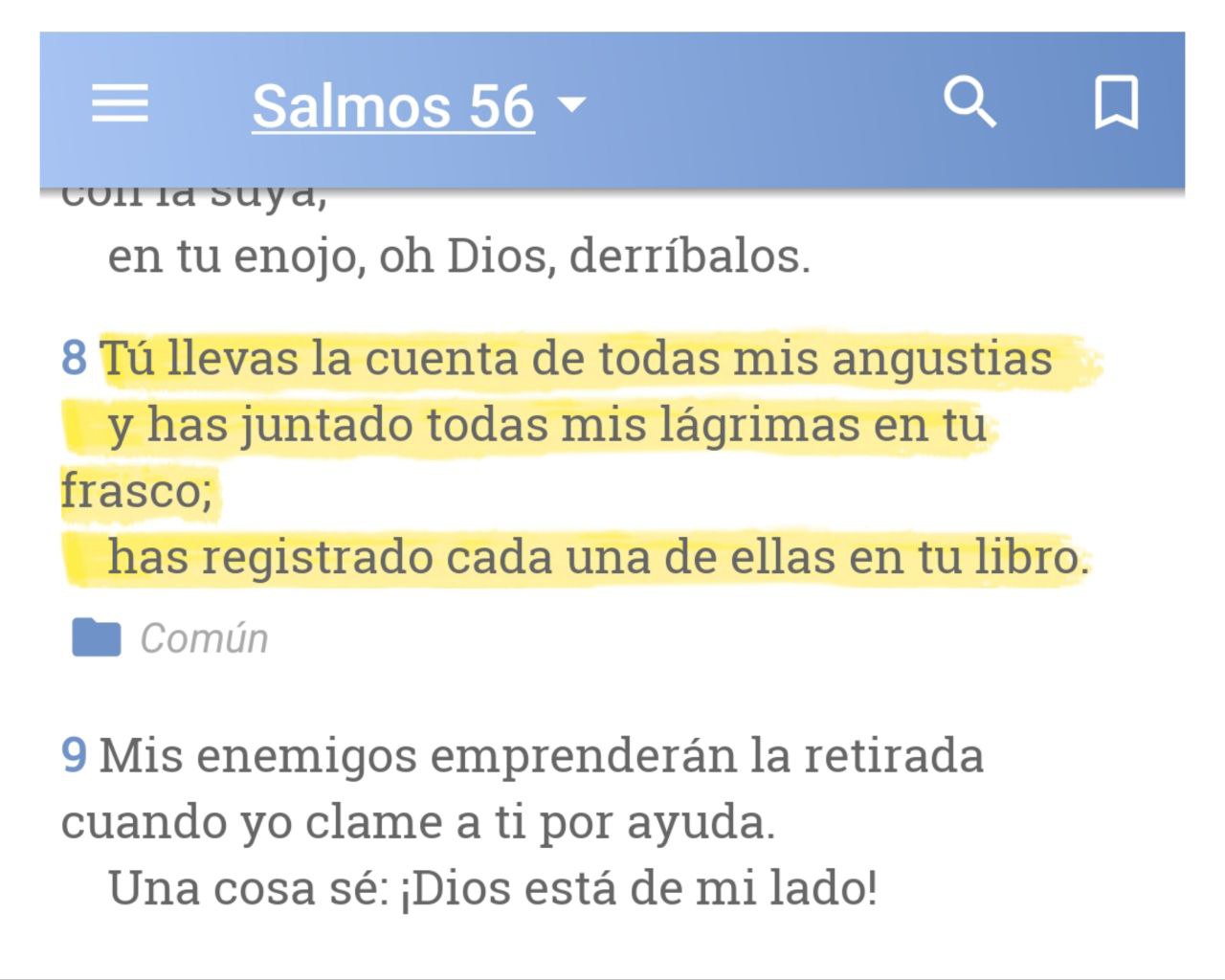 Justamente en el gran libro de la vida nos dejó un registro “Tú llevas la cuenta de todas mis angustias y has juntado todas mis lágrimas en tu frasco; has registrado cada una de ellas en tu libro." Salmo 56:8 (NTV). Definitivamente es grandioso saber que ninguna de nuestras lágrimas se han perdido y que todas tienen un propósito, cada una de ellas están regando una semilla de fe esperanza y renovación en nuestras vidas.