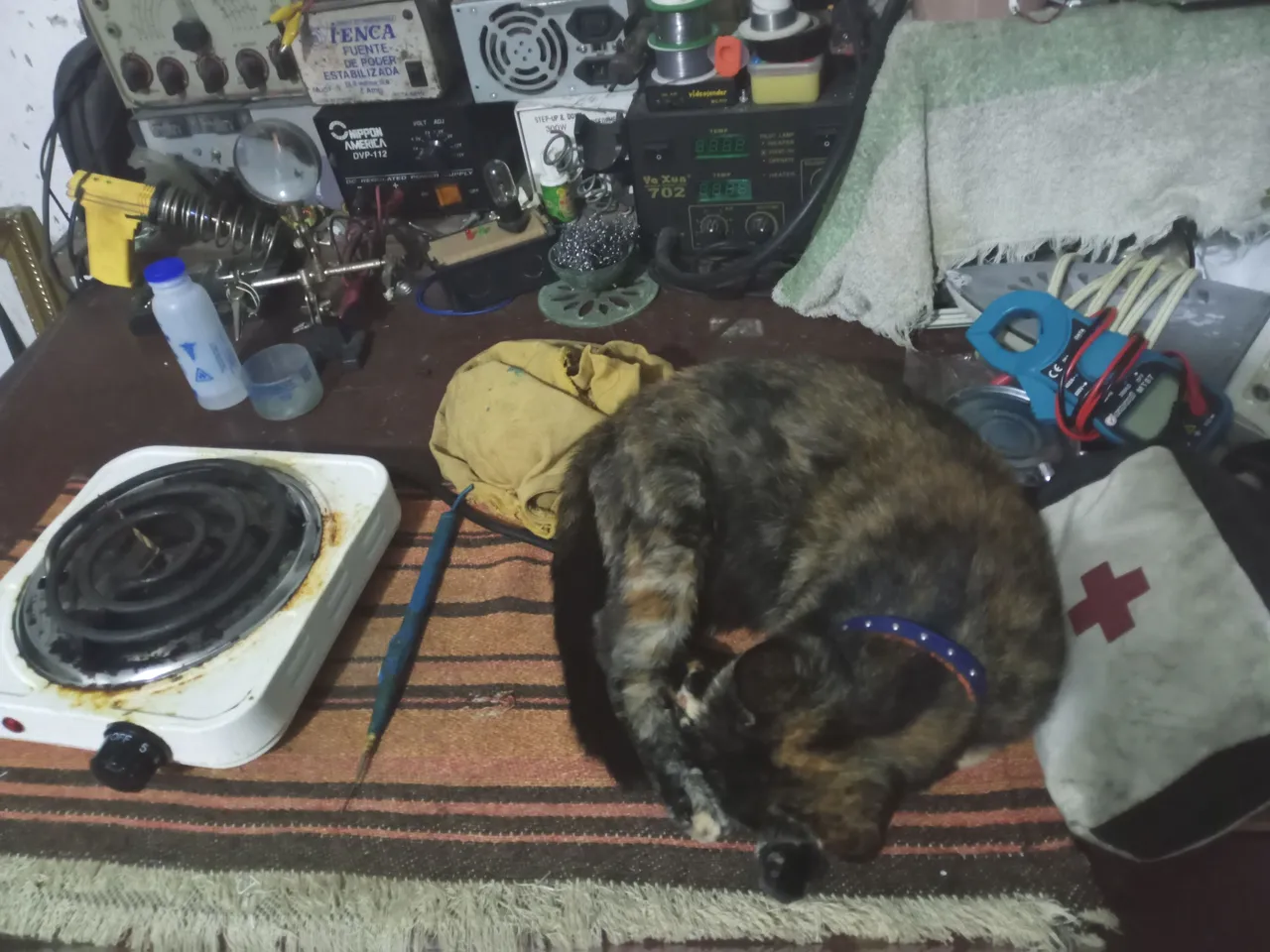 Greetings to the Hive DIY community, I'm happy to share this week with you again. This time, the topic will be servicing a conventional electric coil cooker. This is a cooker for occasional use, not for sustained use. Actually, this week I was hoping to share a service for a Singer sewing machine, which I need to get up and running, but the customer has been late bringing it to the shop. That post will be for next time. While this week's service is being overseen by the neighbor's cat, who has made herself a queen of the workshop.