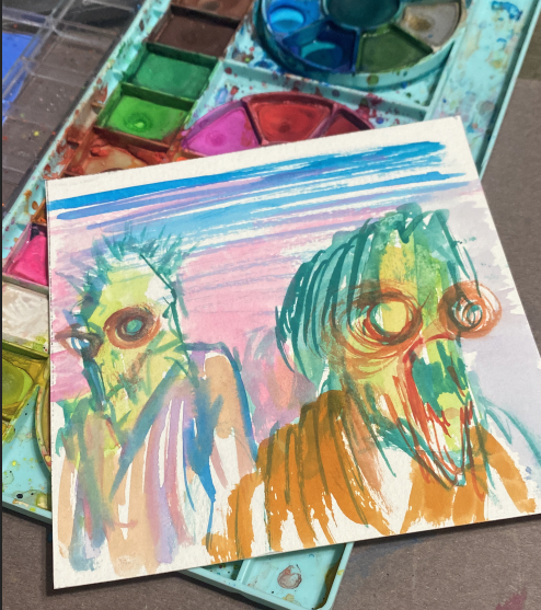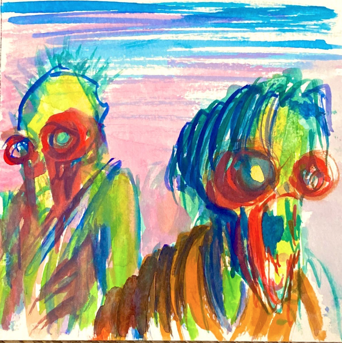 This painting came about for no other reason than the need to slap paint onto paper. It was a compulsion and I gave in and slapped down some paint. When I don't know what to paint, I paint people and turn them into zombies. The first steps are to just lay down the foundation.