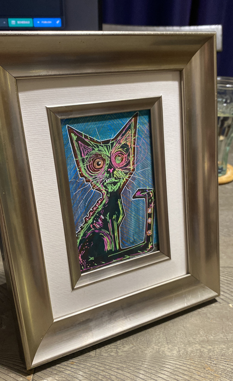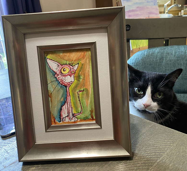 This is our real cat Felix with the framed painting of Furgus the Zombie Cat