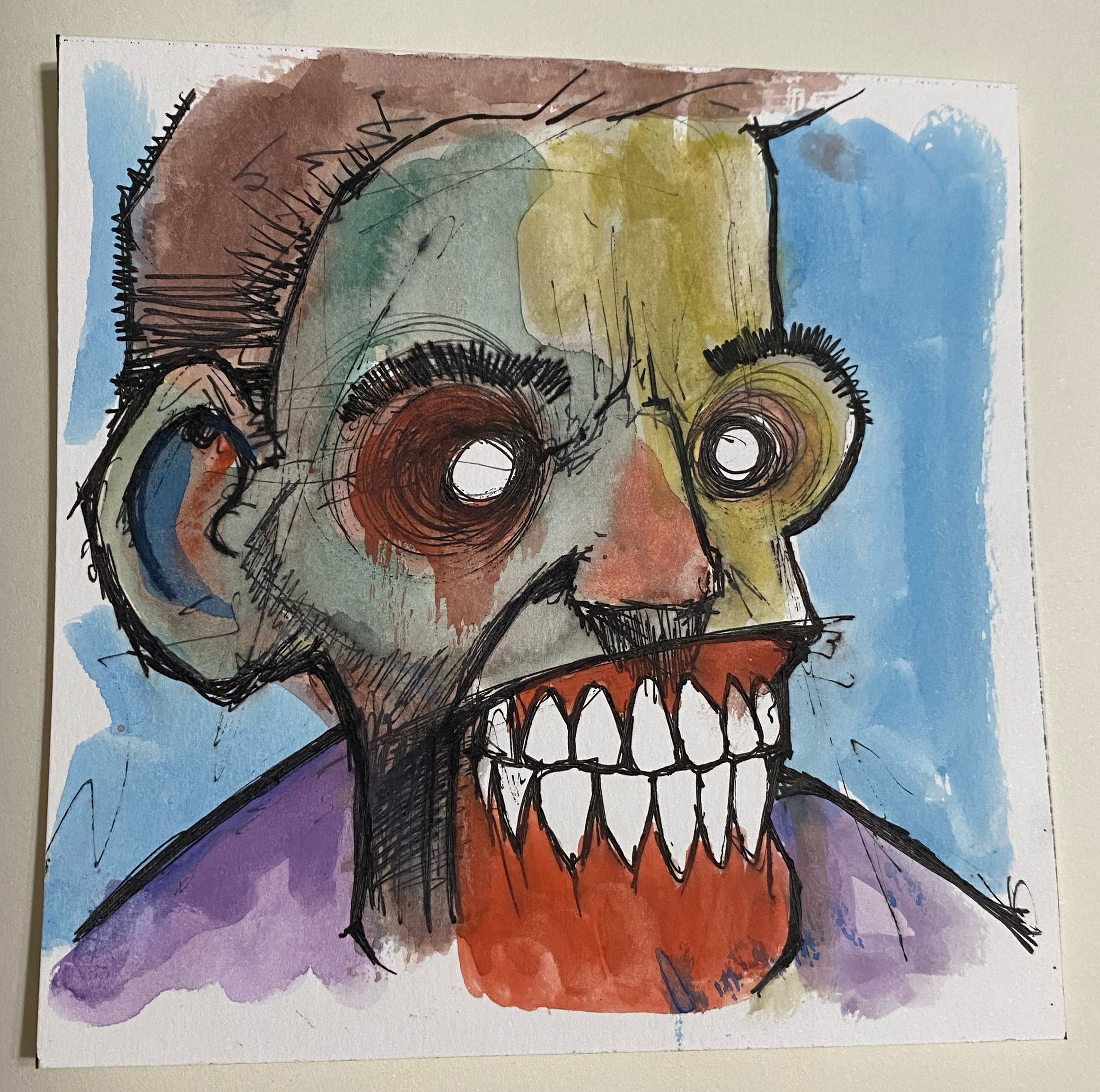 After that slightly disappointing dog start, I went over to one of my square papers and got to work on something a bit more familiar. I call these paintings JAZ - Just Another Zombie.