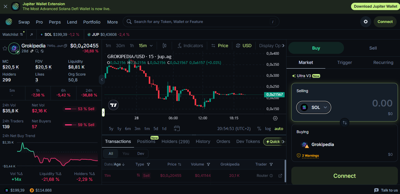 I searched for the name of the encyclopedia and, among the news about Musk and Adevăr, i found price charts, trading volumes and contract addresses. Not Grokipedia Encyclopedia, but the GROKIPEDIA token.