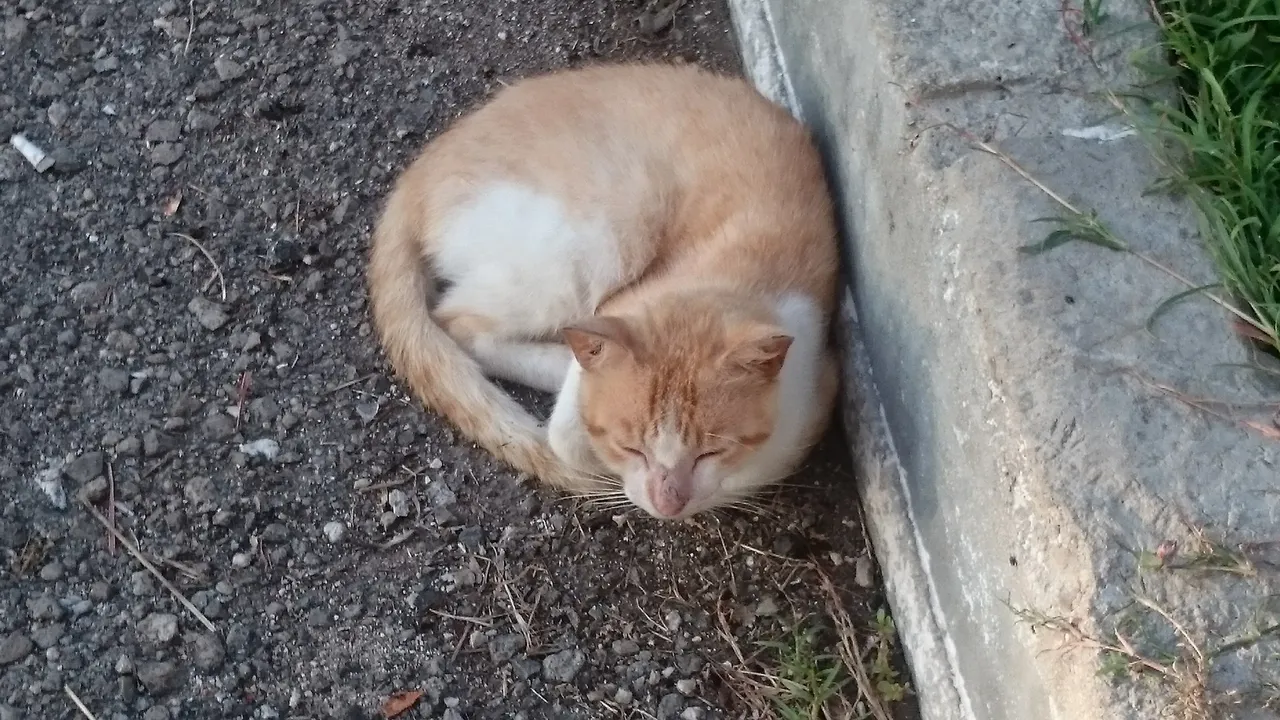 Hello Caturday community, I'm sharing some photos I just took with my phone. As I was leaving my building, it was early, around 7:00 a.m., and I noticed some of the cats that live nearby, and this yellow and white one, sleeping on the asphalt, caught my eye.