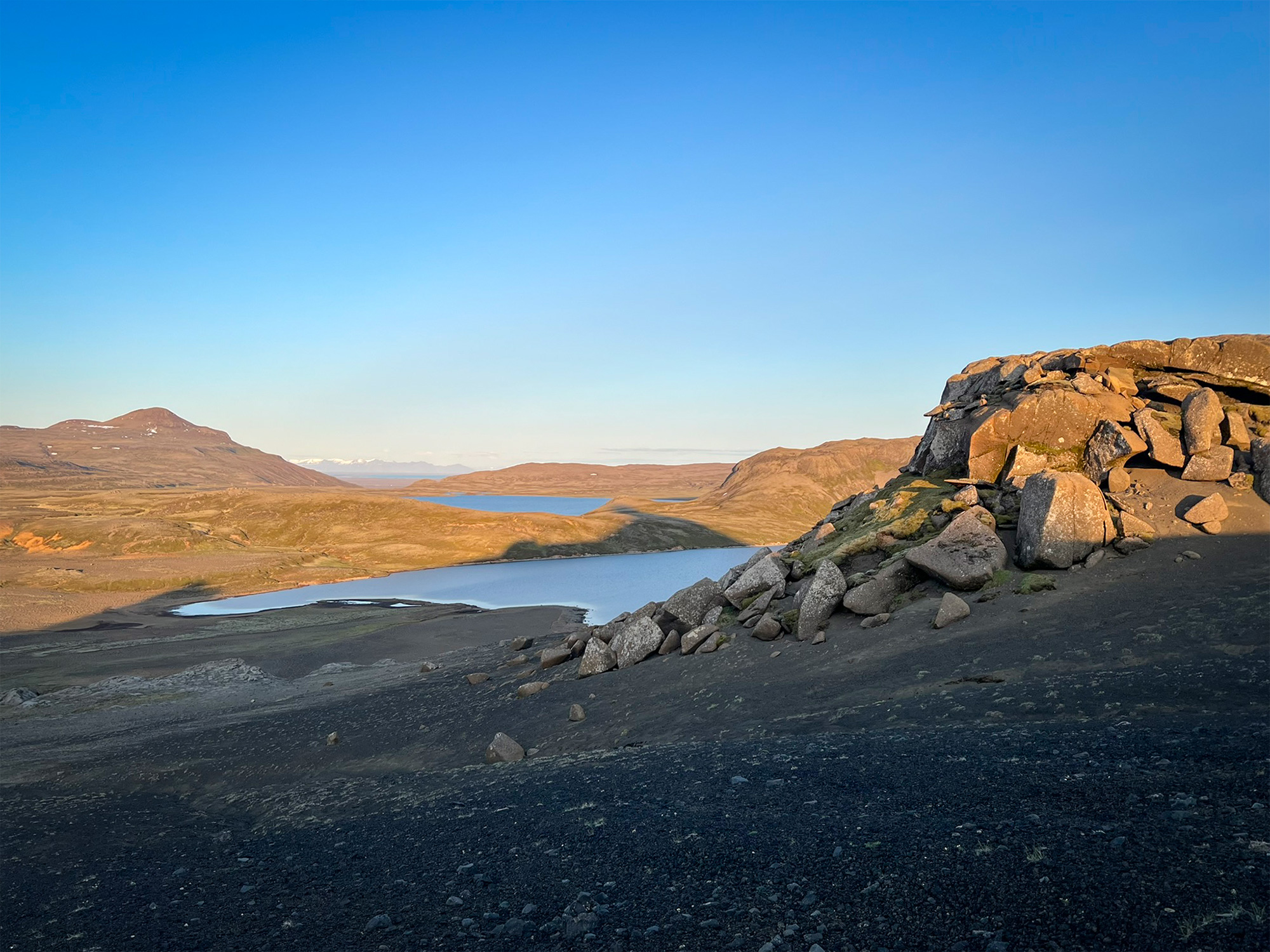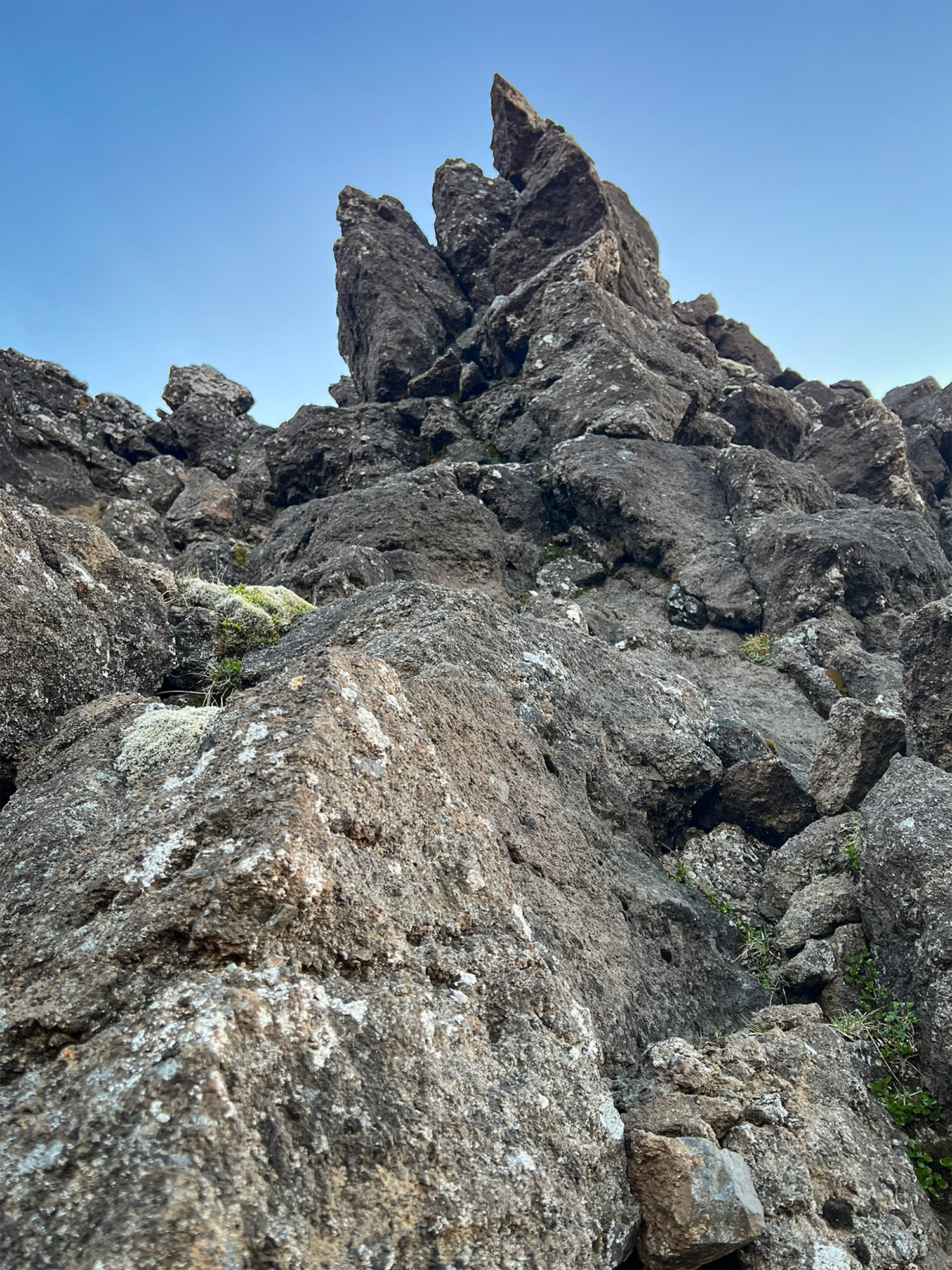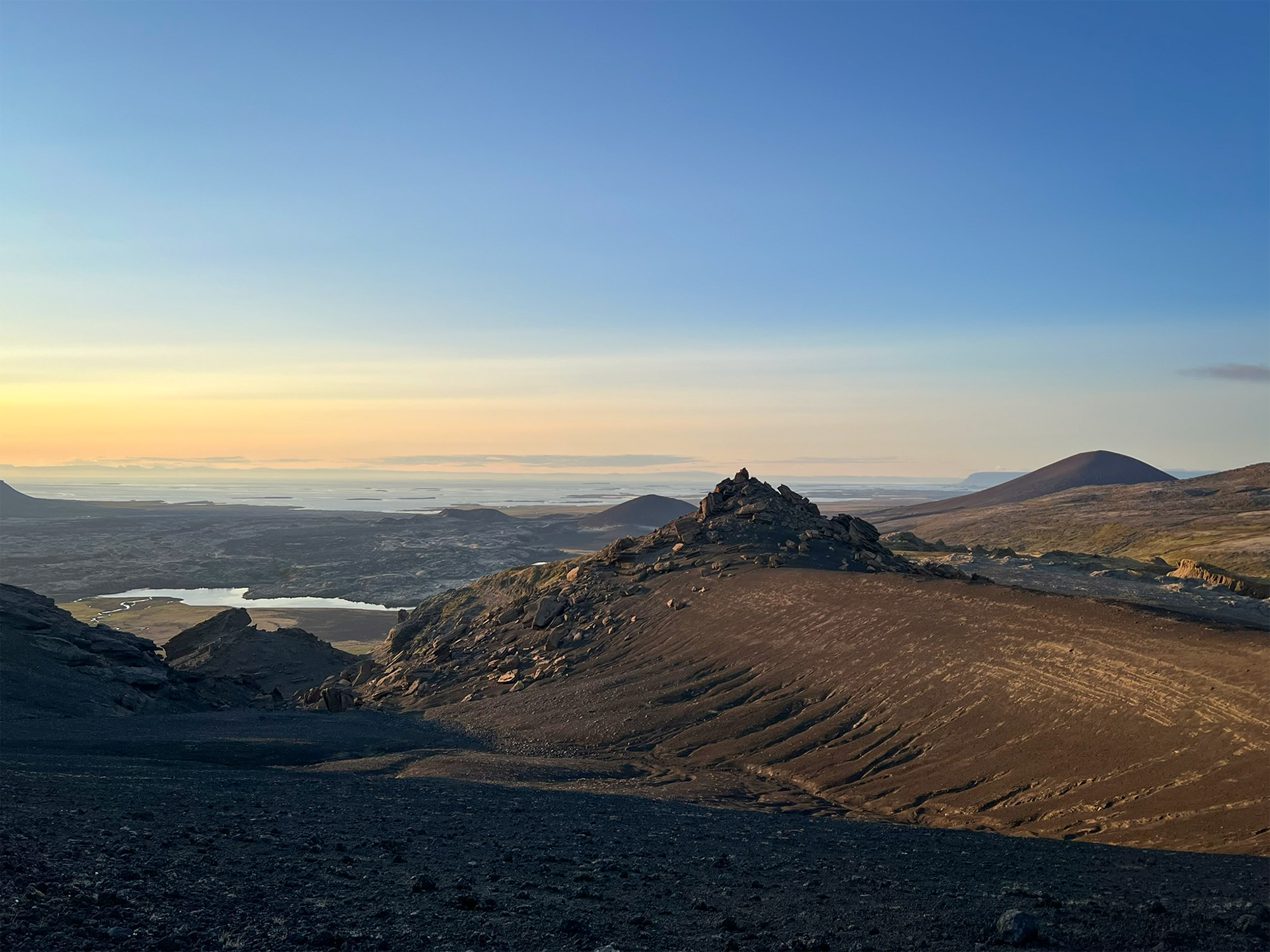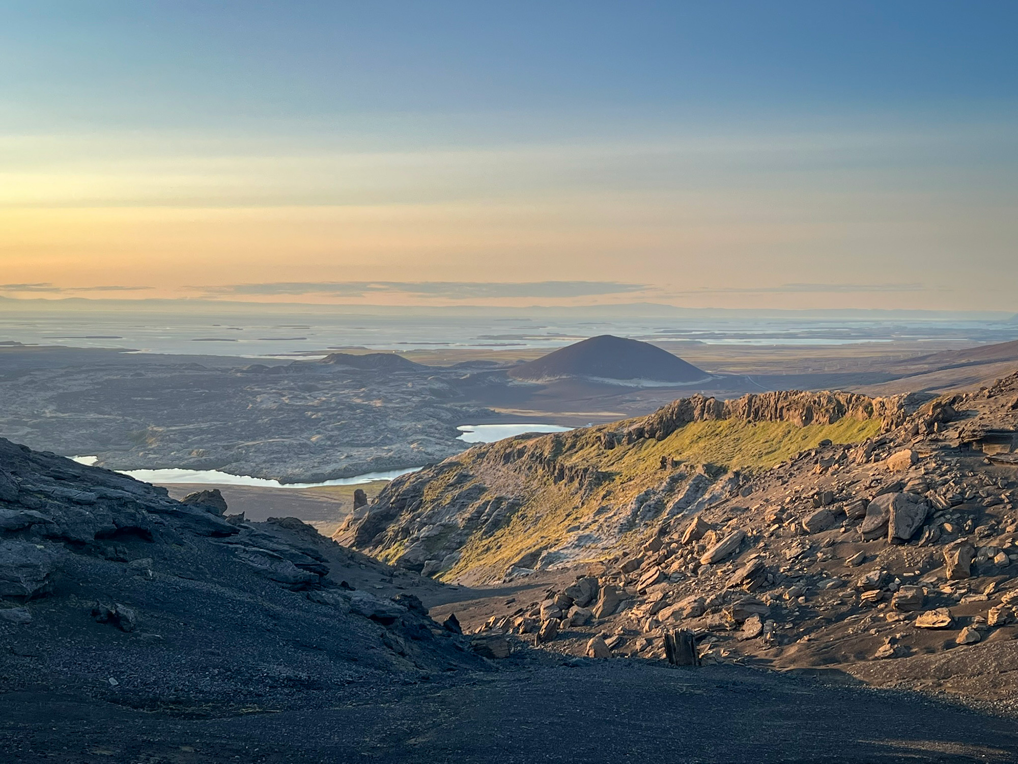 Wspinaczkę zakończyłam pod czubkiem skalnego zwieńczenia Horna, na granicy komfortu. Następnie przeszłam trawersem kawałek na północ, by bez przeszkód nacieszyć oczy widokiem na pole Berserkjahraun.