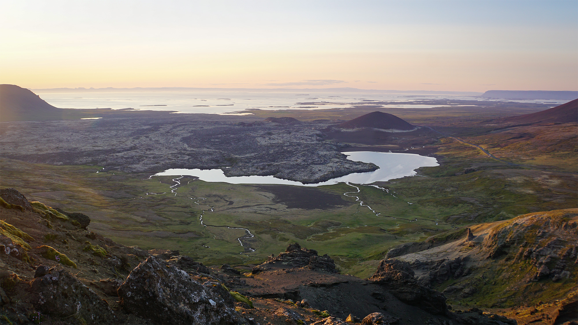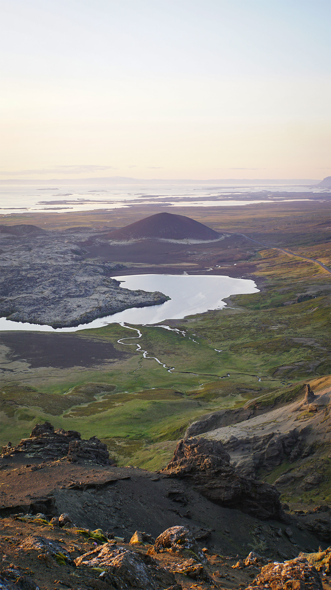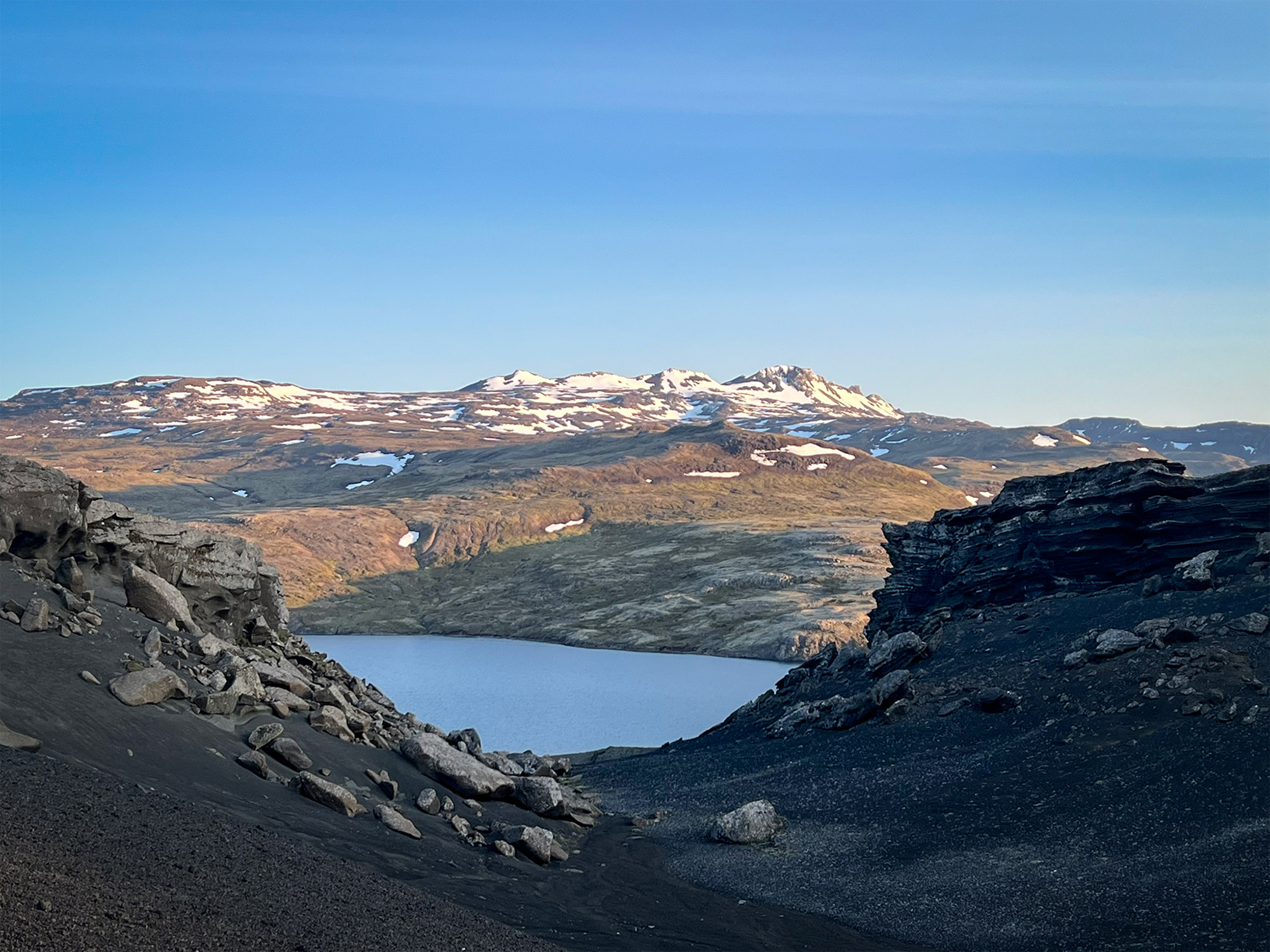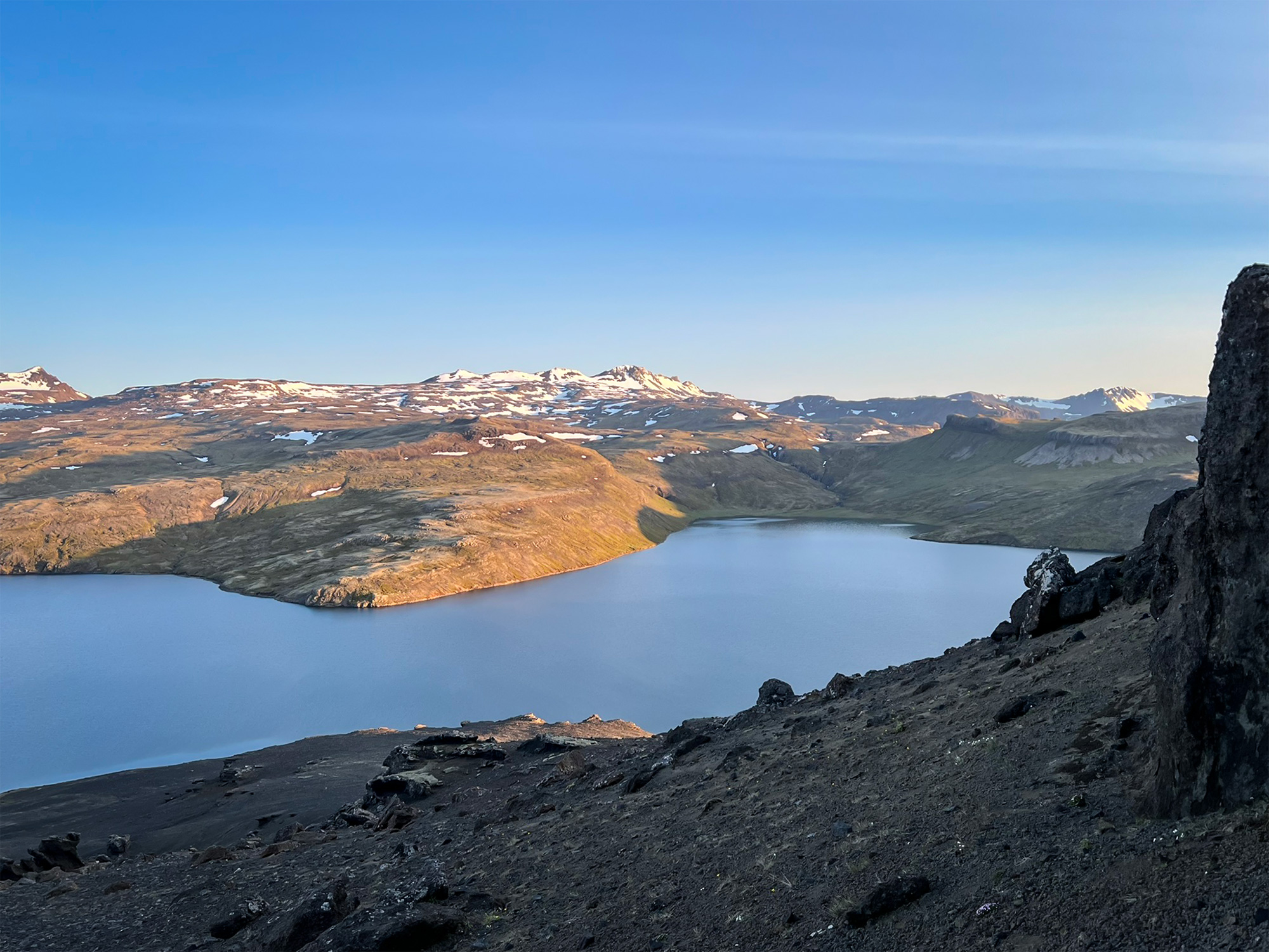 Wspinaczkę zakończyłam pod czubkiem skalnego zwieńczenia Horna, na granicy komfortu. Następnie przeszłam trawersem kawałek na północ, by bez przeszkód nacieszyć oczy widokiem na pole Berserkjahraun.