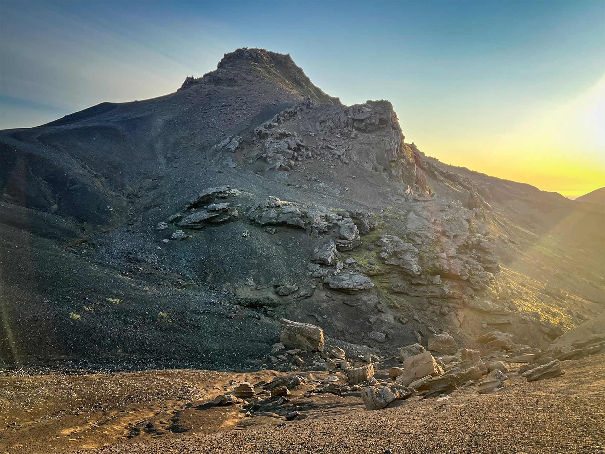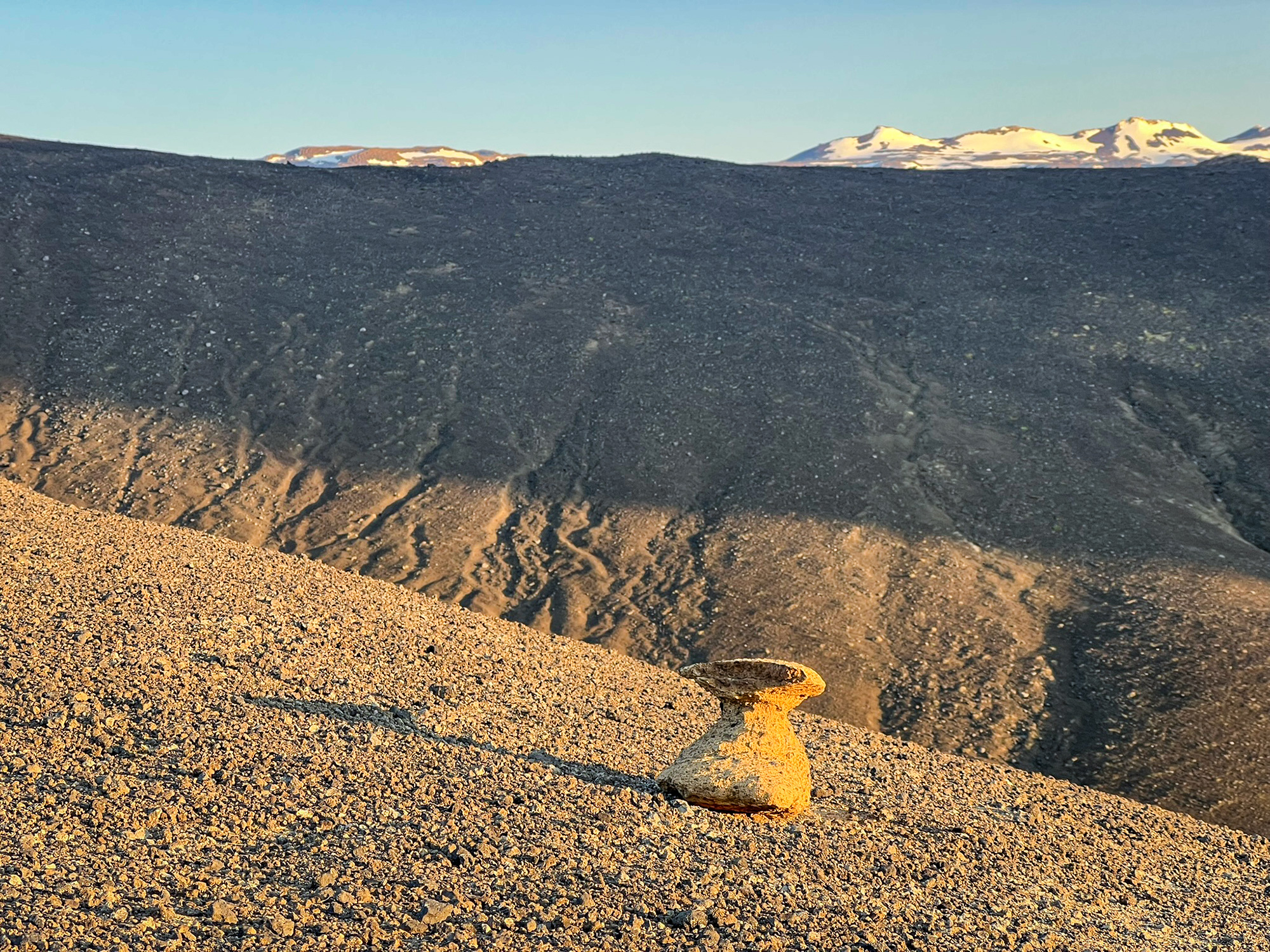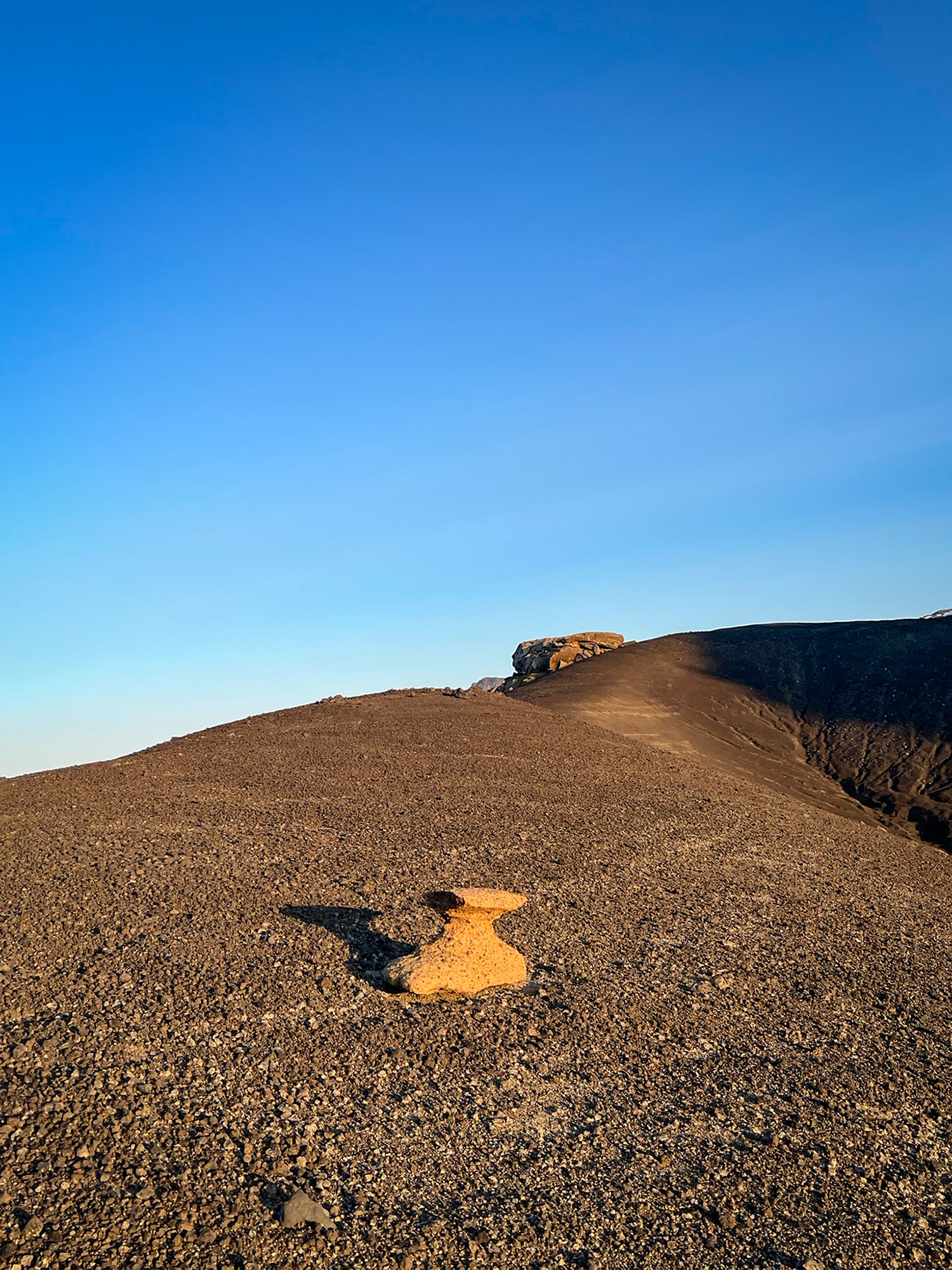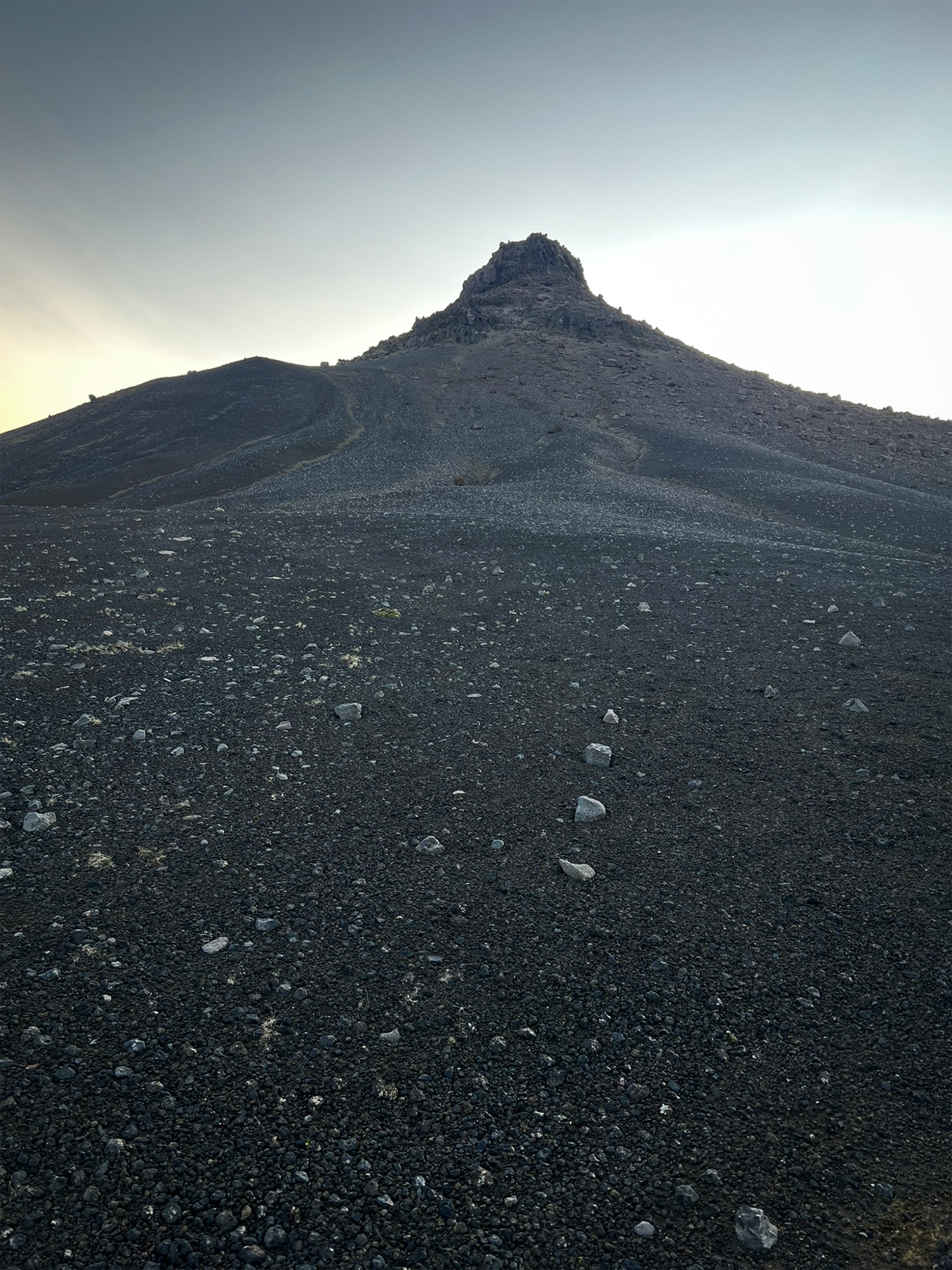 Zbliżała się 22.30, gdy podchodziłam pod szczyt. Jego cień skutecznie tłumił ciepłe promienie zachodzącego słońca. Przez chwilę czułam dojmujące osamotnienie w tym dziwnym, odrealnionym wymiarze. Zaraz jednak objęła mnie fala spokoju i przekonania, że jestem we właściwym miejscu, całkowicie bezpieczna. I że nigdy nie jestem sama, jakkolwiek to rozumieć. Jakby na potwierdzenie tego, na sypkim podłożu wypatrzyłam delikatne ślady pozostawione przez inną, dwunożną istotę. Było mi zadziwiająco dobrze na tej czarnej pustyni.