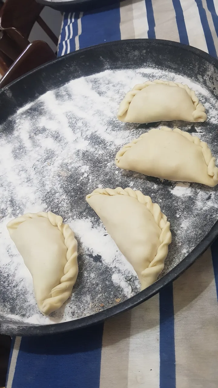 And then again, my specialty: empanadas. Here, I take all my time, starting early, preparing the filling, cooking the meat, adding the eggs, olives, potatoes, bell peppers, onions—everything, everything. Once I'm done cooking the filling, it goes straight into the freezer, and after 30 minutes, I take it out to put it in the HOMEMADE empanada shells made by my sister.