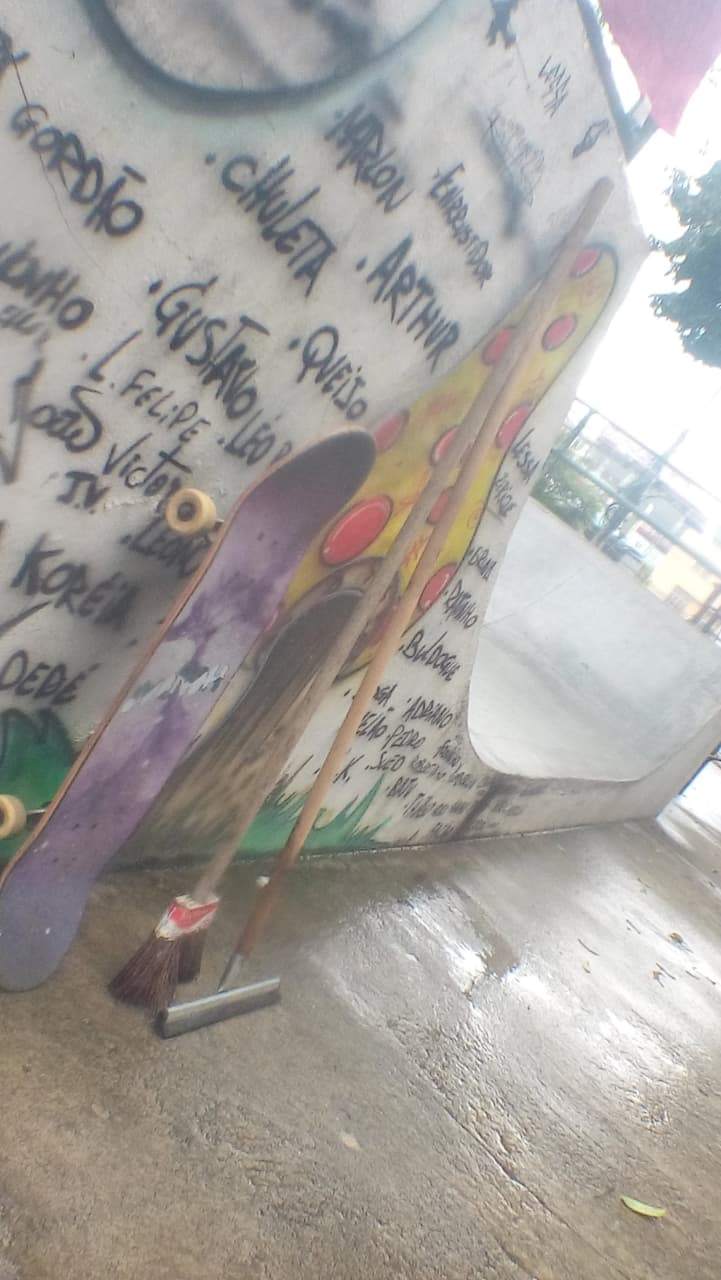 That day, we arrived very early, as always, but it was raining heavily, so we brought a broom, a mop, and an old shirt to dry the park so we could skate, even if only a little.