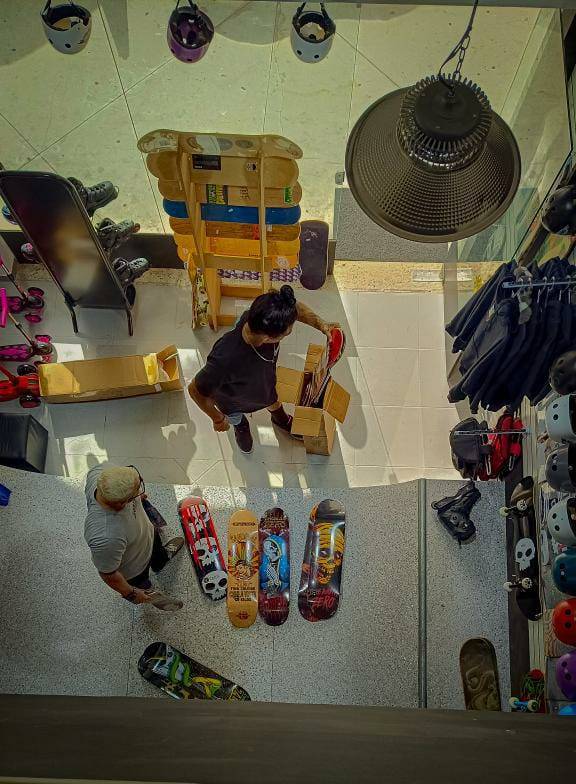 The store was beautiful, with the wood on the walls. I helped with the decoration, painting, and much more. We installed a mini ramp made from recycled materials retrieved from the bottom of the sea.