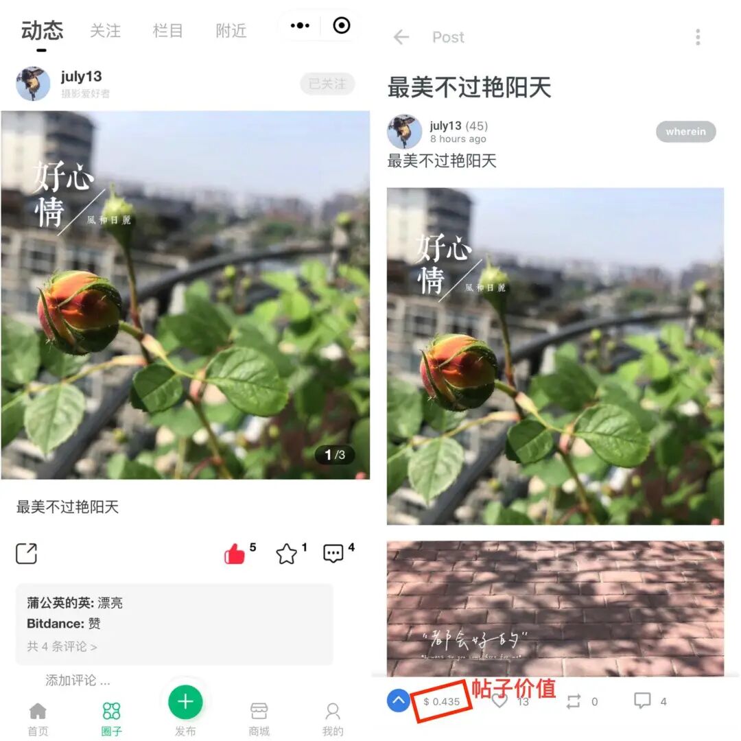 与微信圈子一样,wherein从内容社区出发。社区成员可以在你们的王国进行创作,其他成员对帖子的点赞将决定帖子获得的社区积分。社区积分通过区块链技术记录在一个公开账本上,一经记录,将不可篡改。社区积分亦支持点对点转账,体验与支付宝一样。