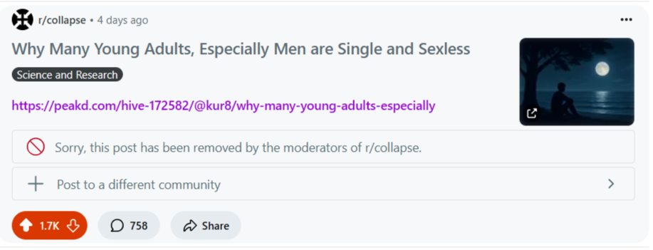 Okay, now, a dramatic part. The bronze was practically in the pocket of the contestant named @x-rain thanks to a share that gained 300K+ views. The post itself (by @theworldaroundme) sparked a huge response on Reddit, and reading the comments under it was a real deep dive into the romantic struggles of Americans. However, at the very last moment, that share was deleted...