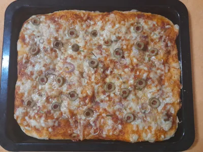 Flatten the dough a little to place it on the pan, then pour the tomato sauce, cheese of your choice, onion, and olives on top.