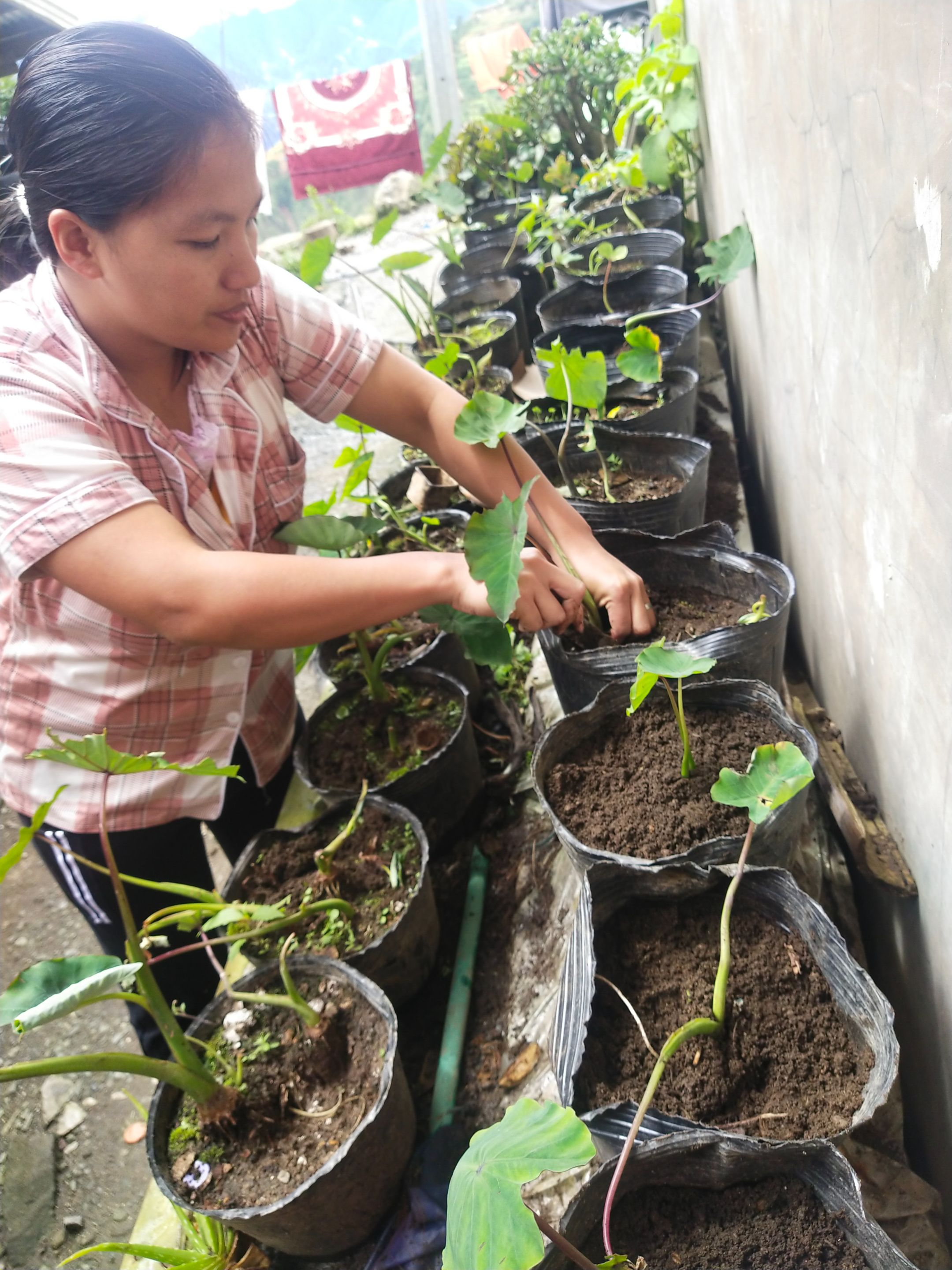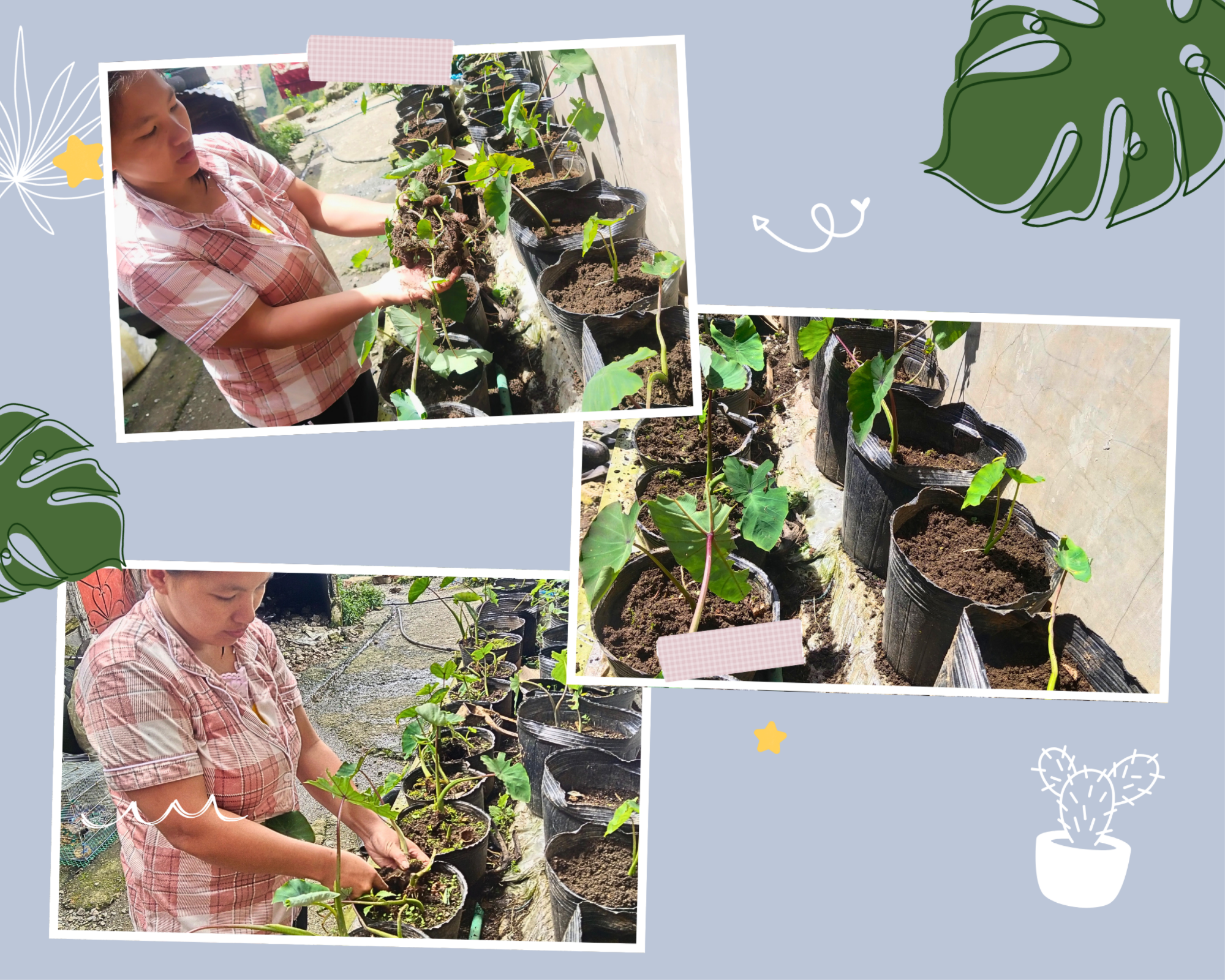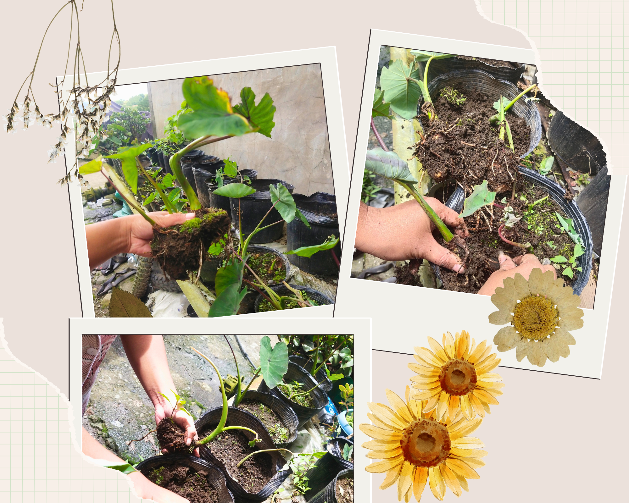 I used my little cultivator to gently uproot the baby taro, then planted them into separate pots. Before planting, I made sure the soil was loosened or cultivated and ready so that the roots of the baby taro can grow and spread freely. I did this for all the baby taro until every pot was filled. I also removed the weeds and cultivated the soil around the mother taro so its roots can spread freely.